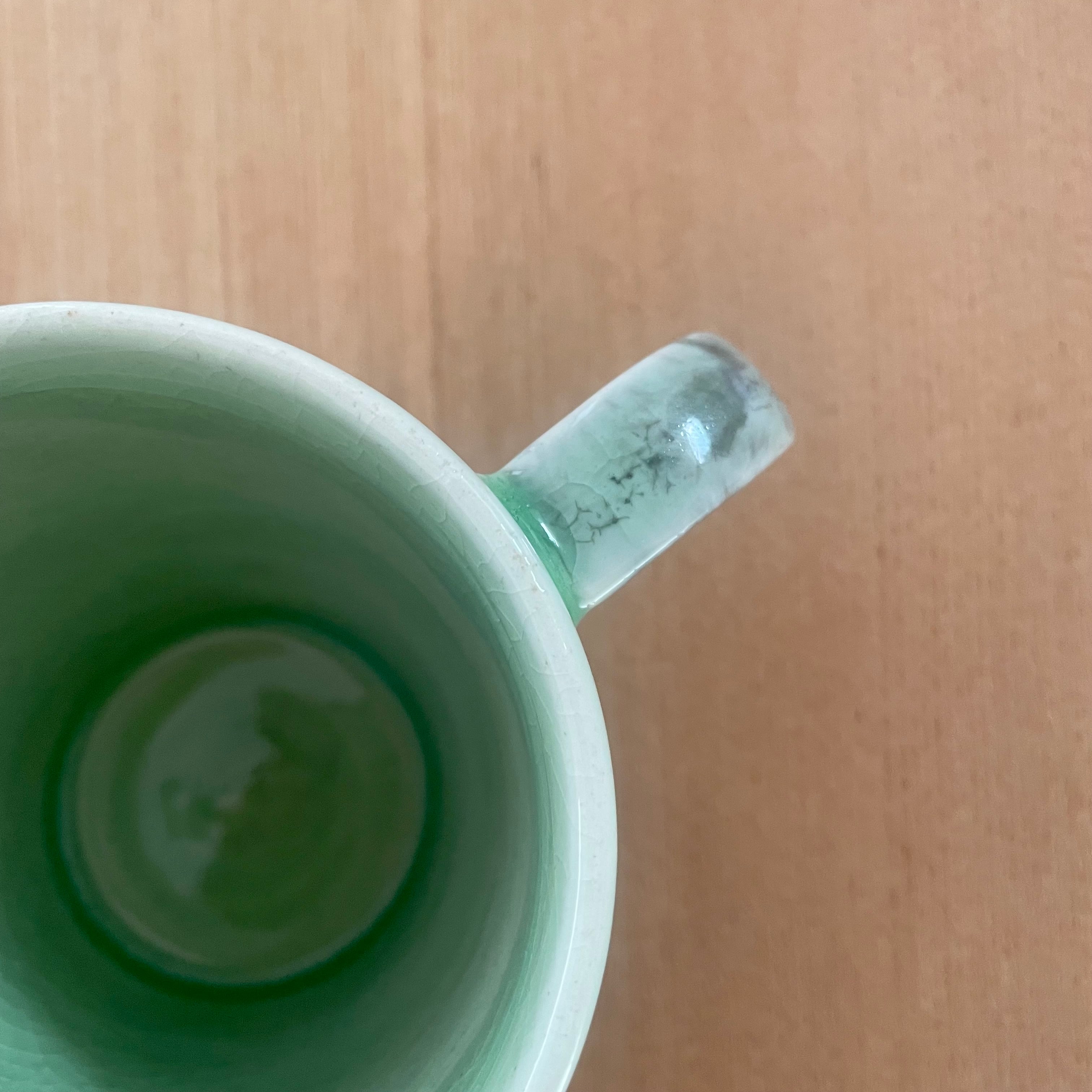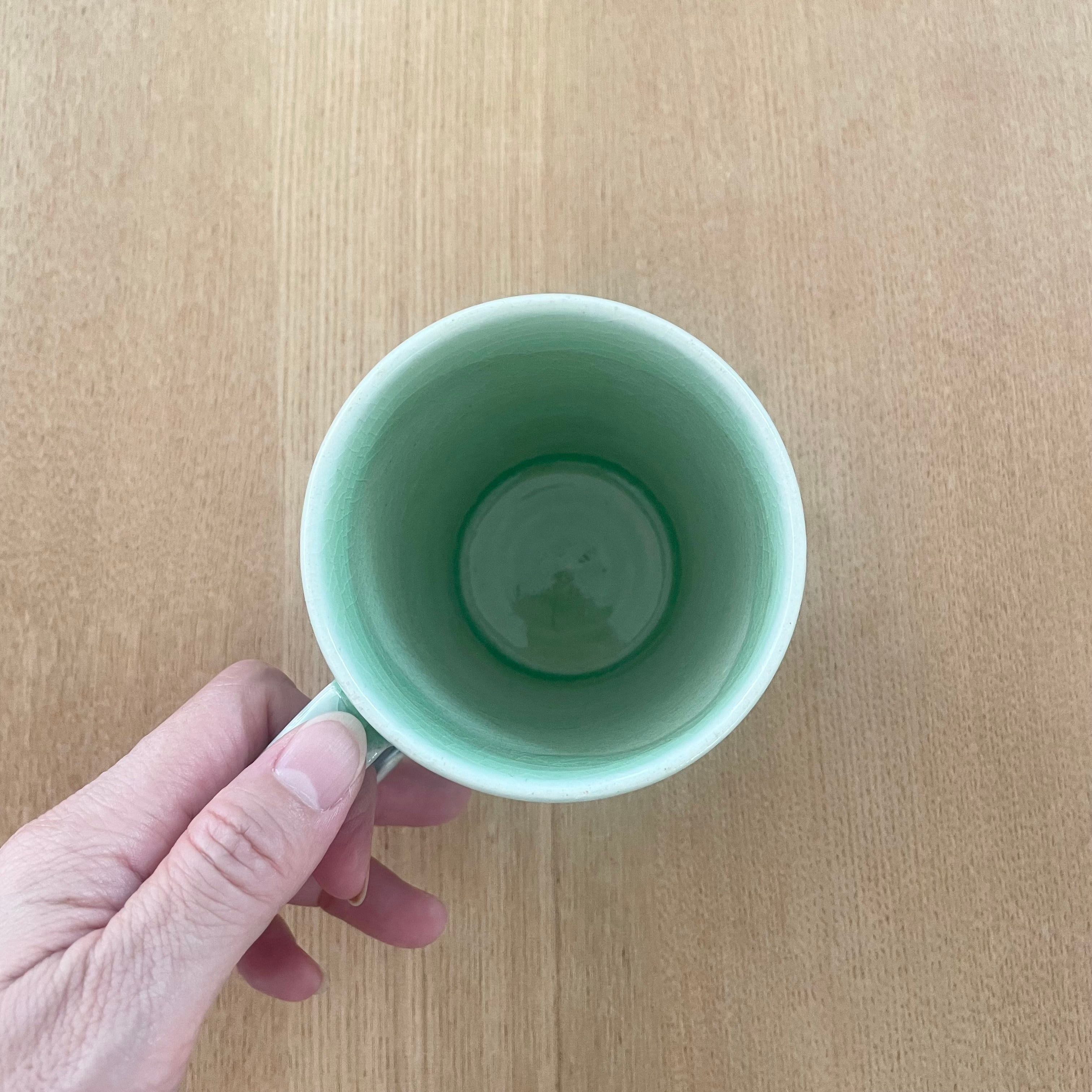英字のような線刻と大胆に色付けしたようなアートな雰囲気のマグカップ。持ちやすく口当たりも良いので店頭でも人気の商品です。色違いのペアギフトにもおすすめ。