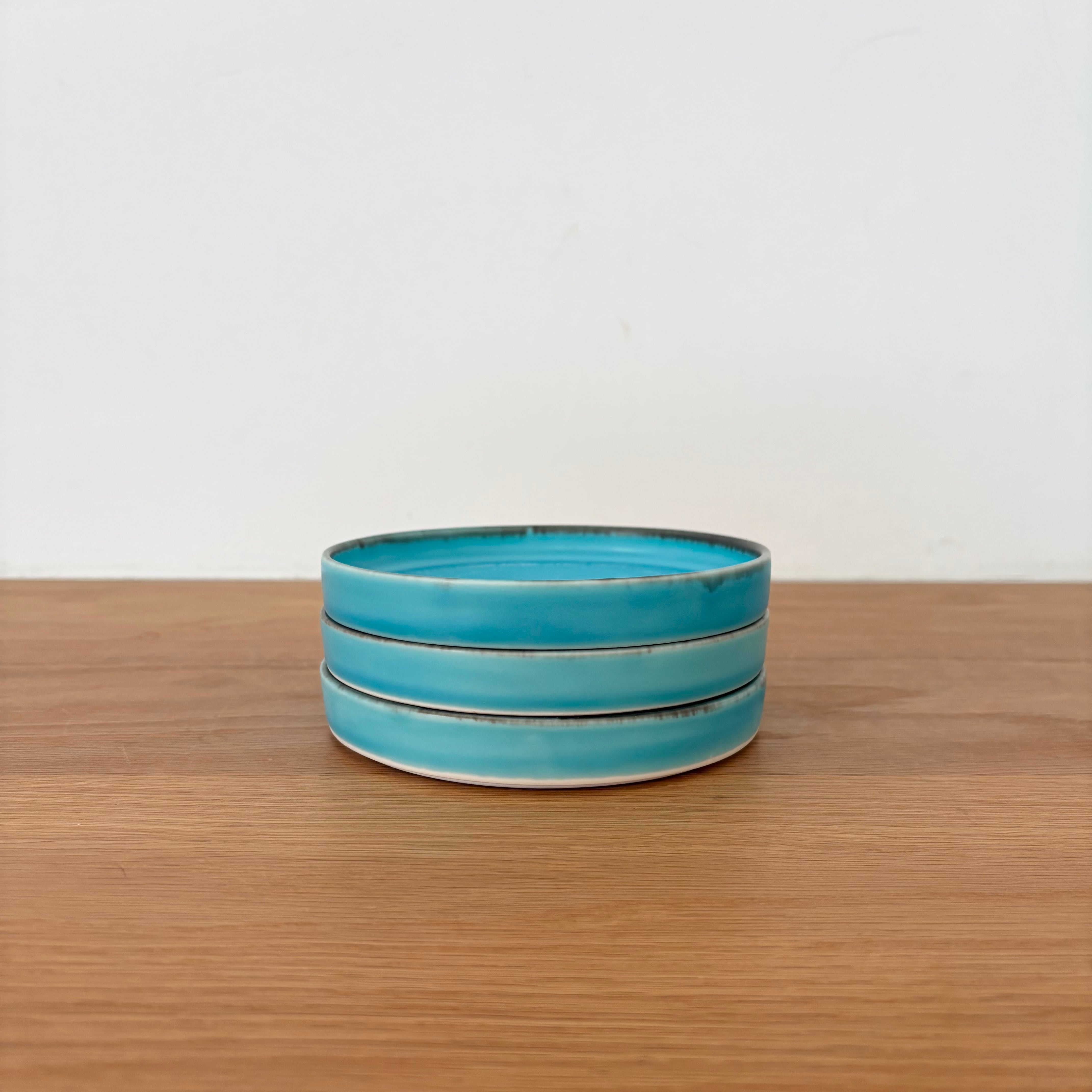 食卓が華やかになるターコイズブルーの小ぶりなお皿。マット感のある質感も艶々過ぎず渕の錆色としっくりきてます。収納もスタッキングが出来、食洗機も電子レンジもOKととっても機能的な器です。