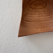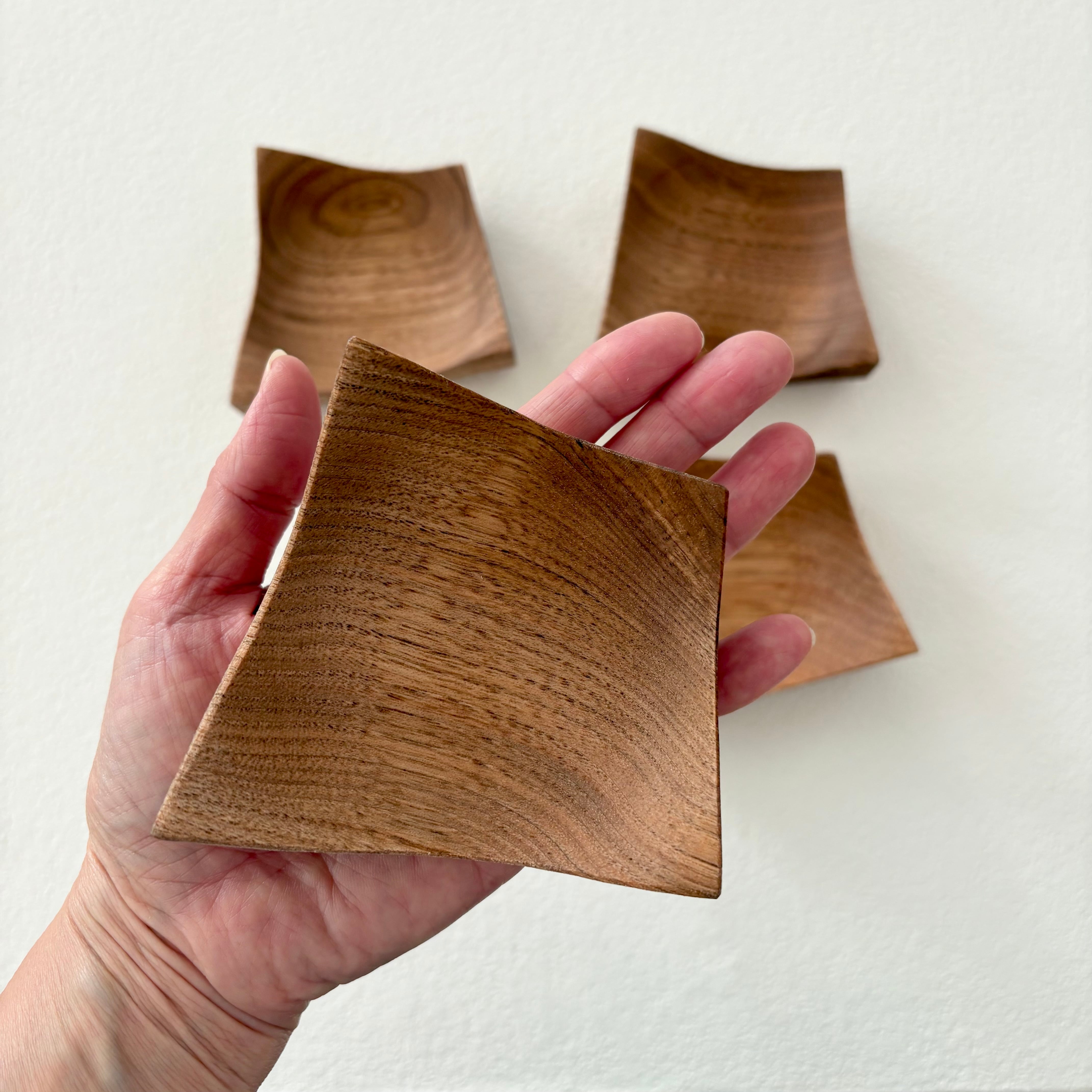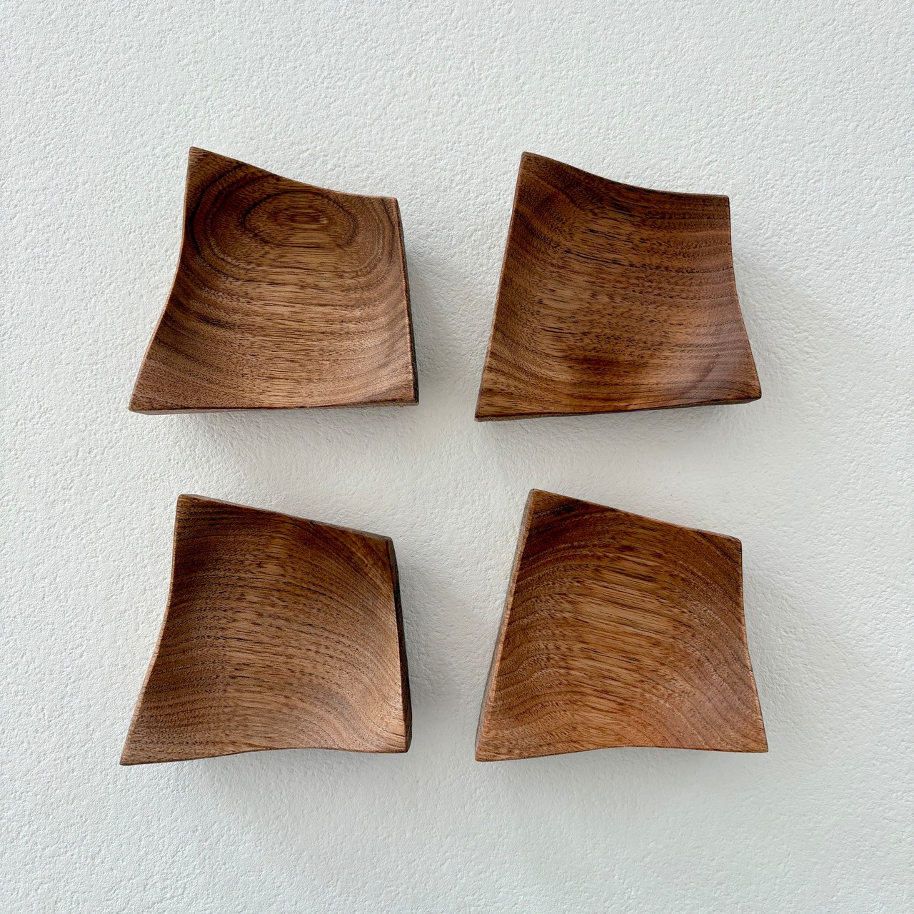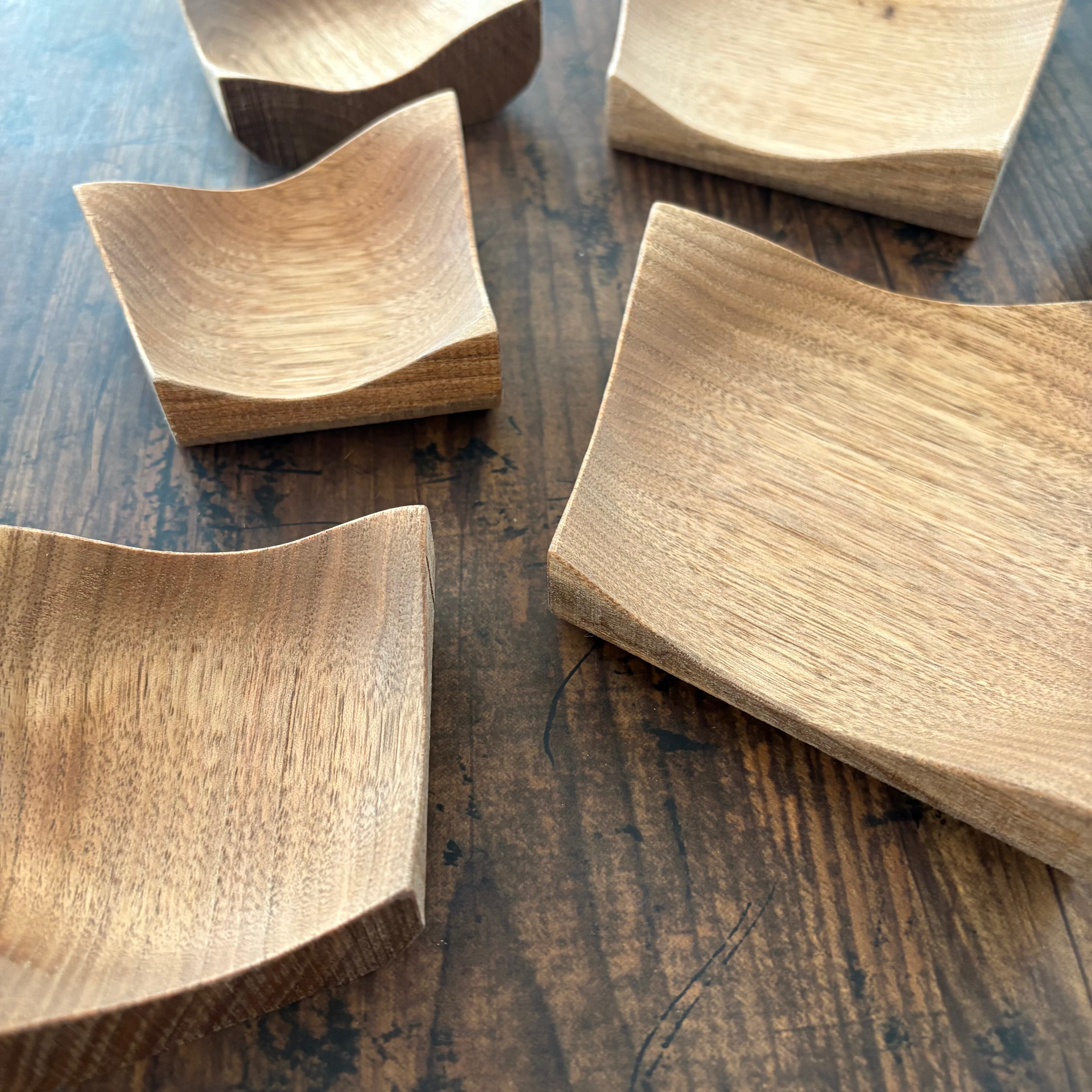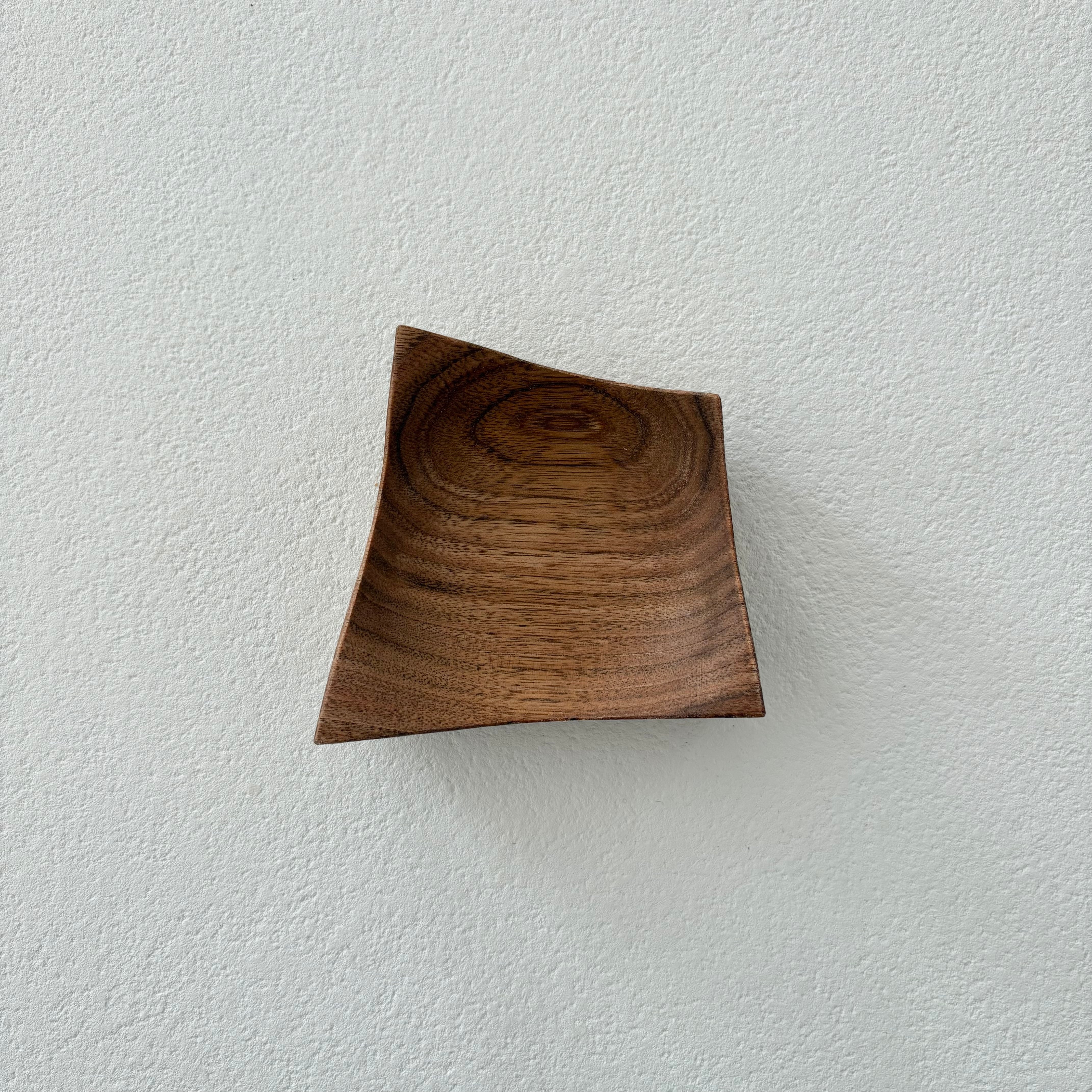 胡桃の木の温かみを存分に感じられるいびつなお皿。お茶托としても、ナッツなどのおつまみをのせても小ぶりながら主役級です。天然木を使用しておりますので一つひとつの色味や木目は違います。