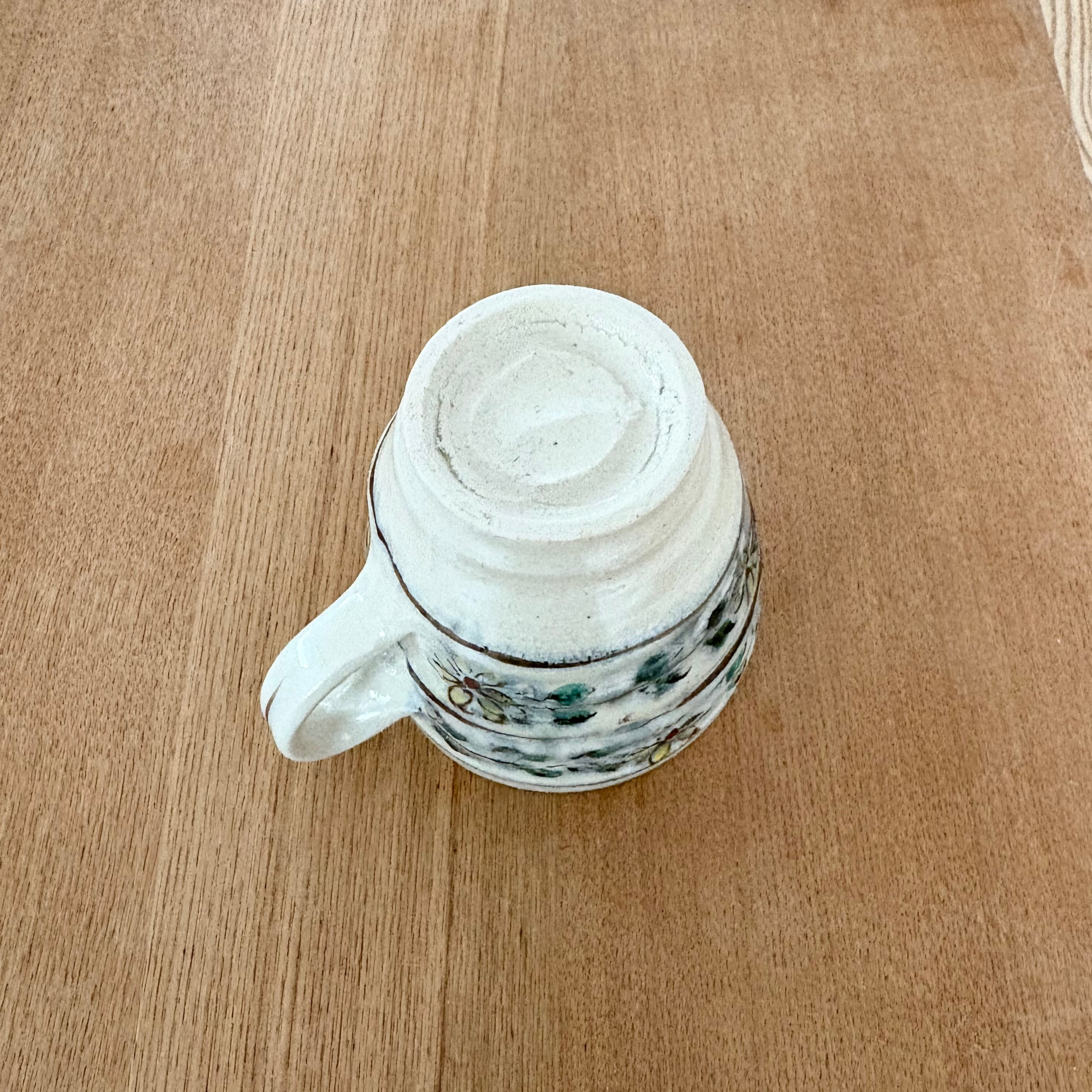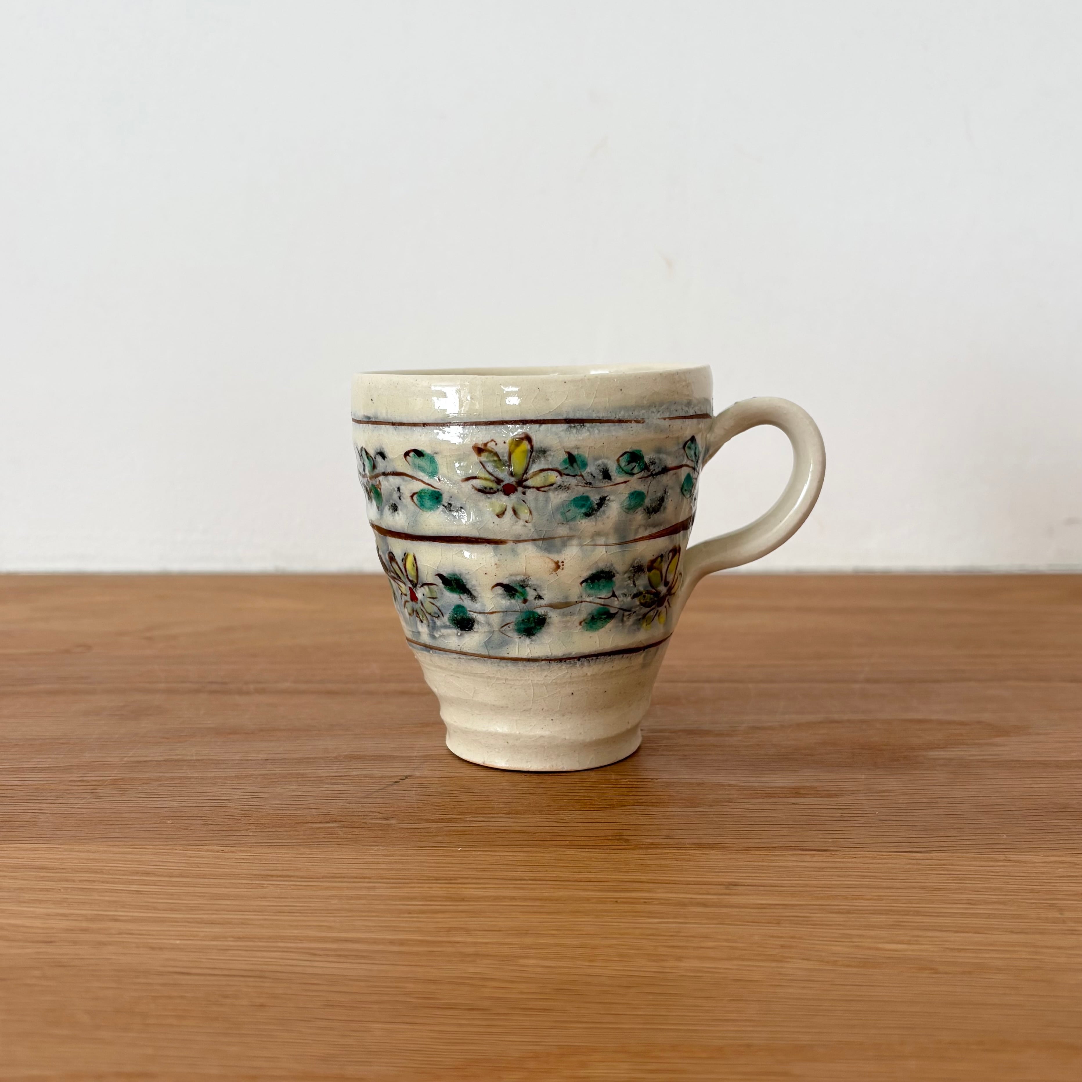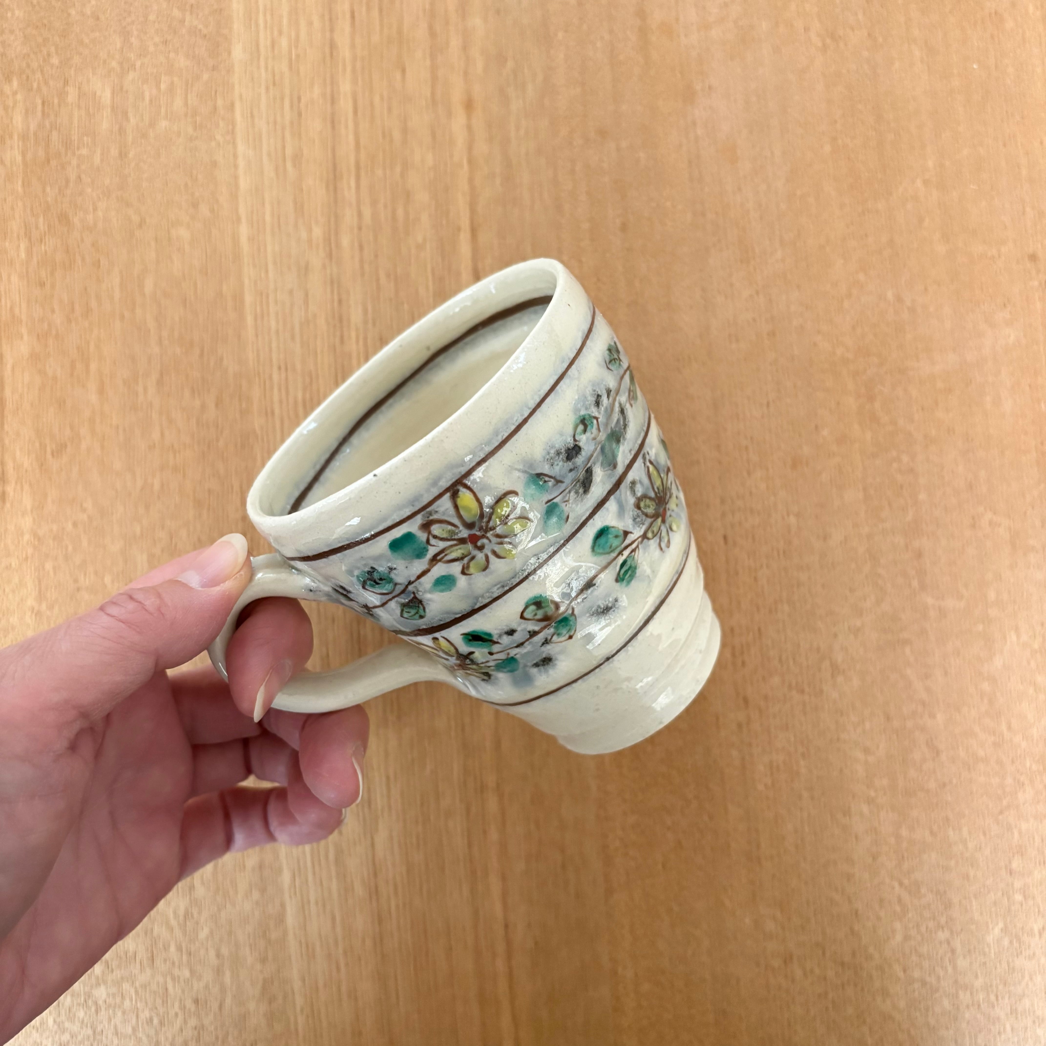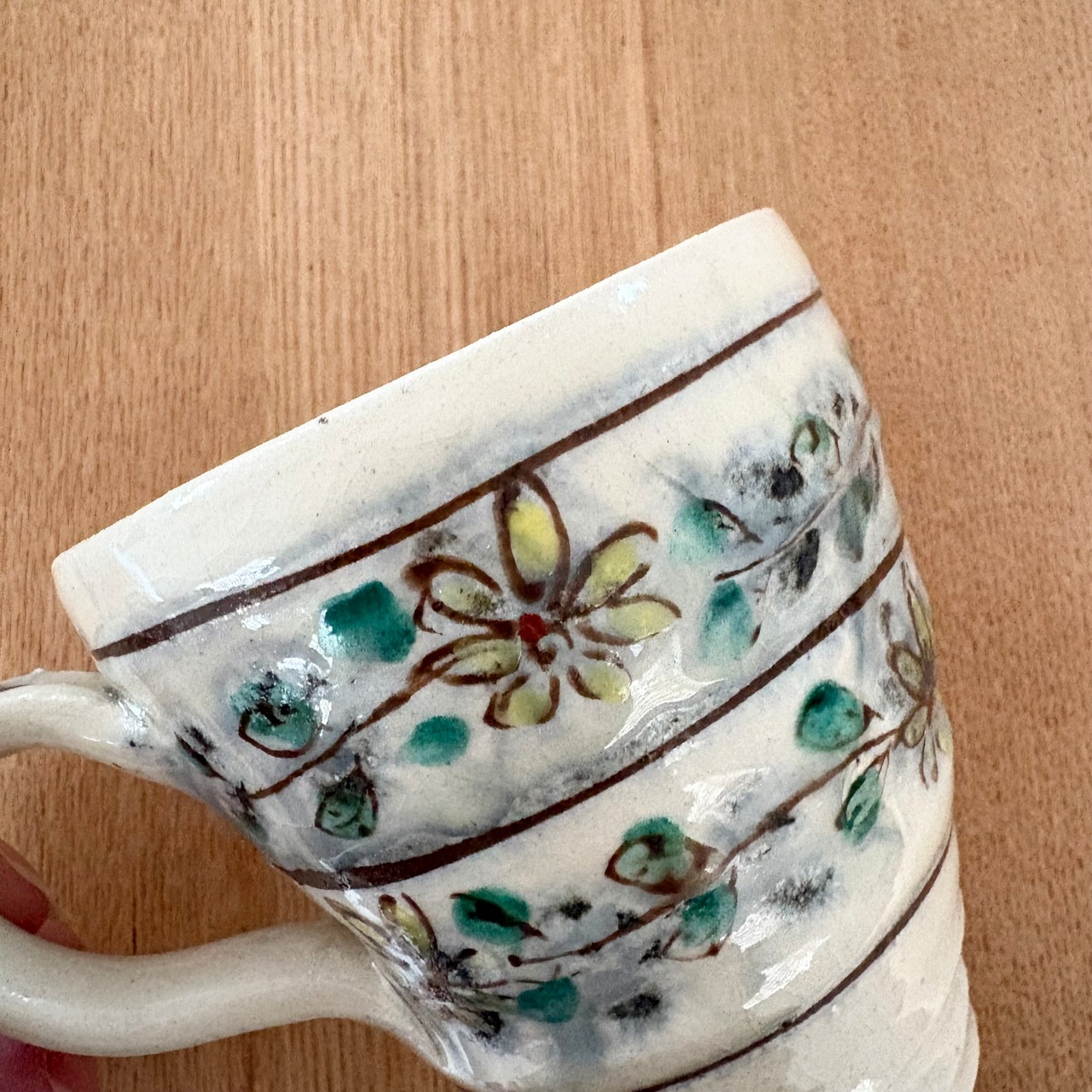 手で描かれた黄色のお花が愛らしくて春らしいマグカップ。なんと言っても180gと軽いのが魅力的です。