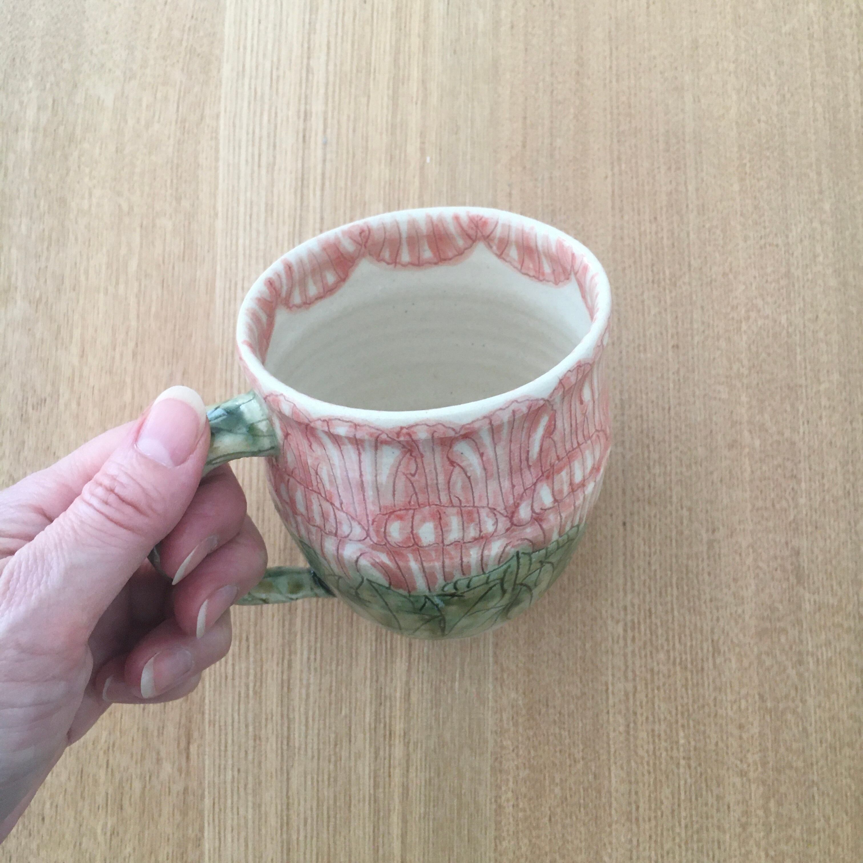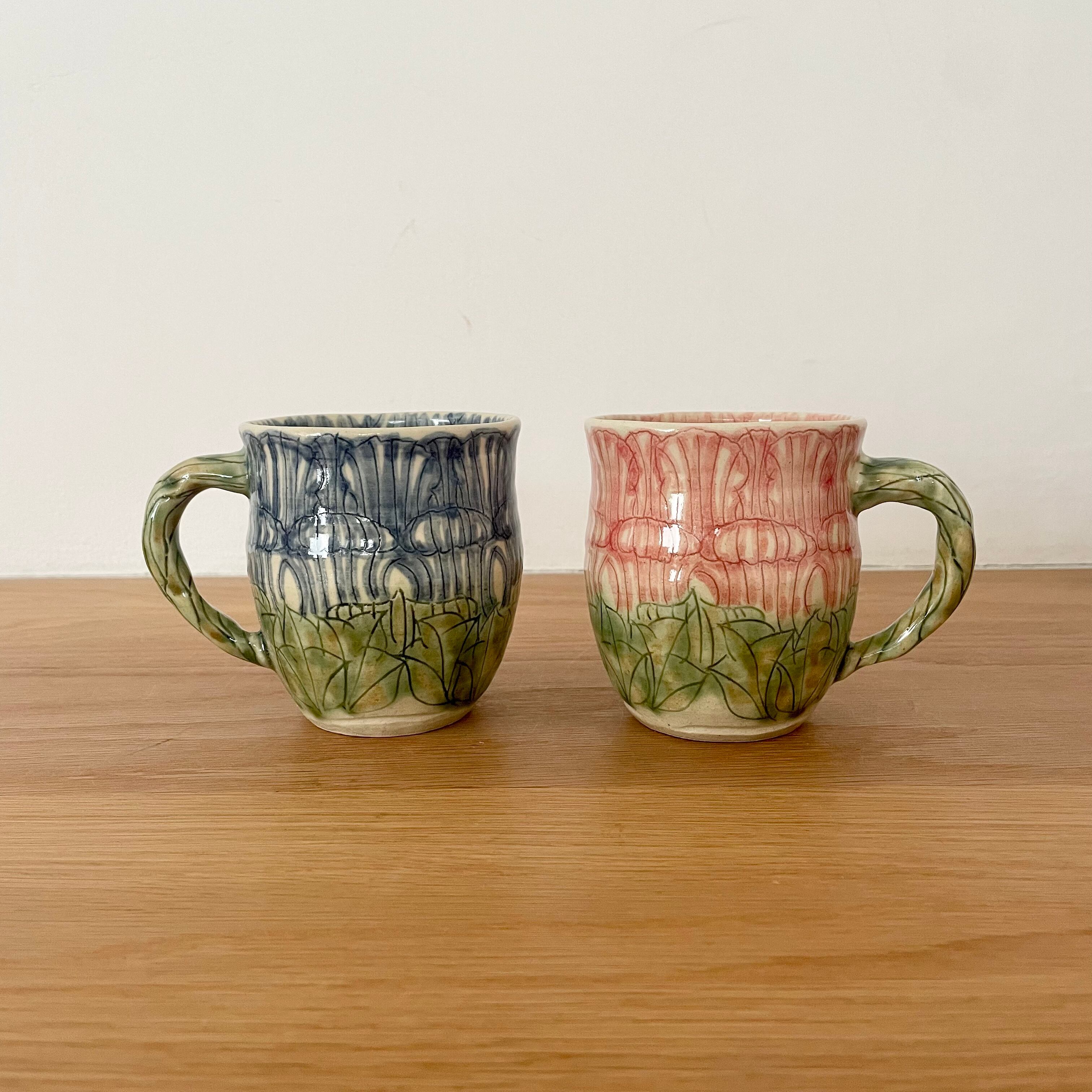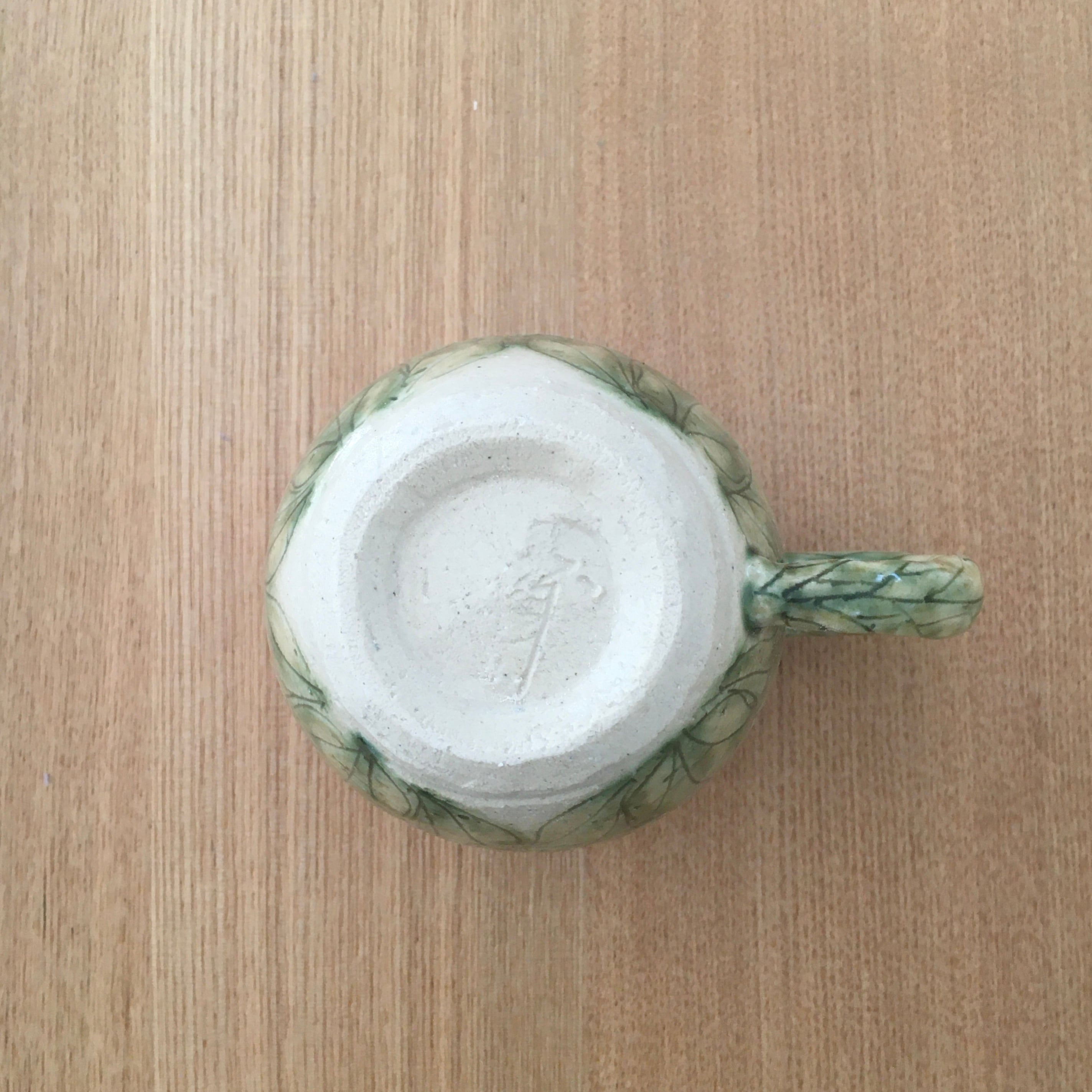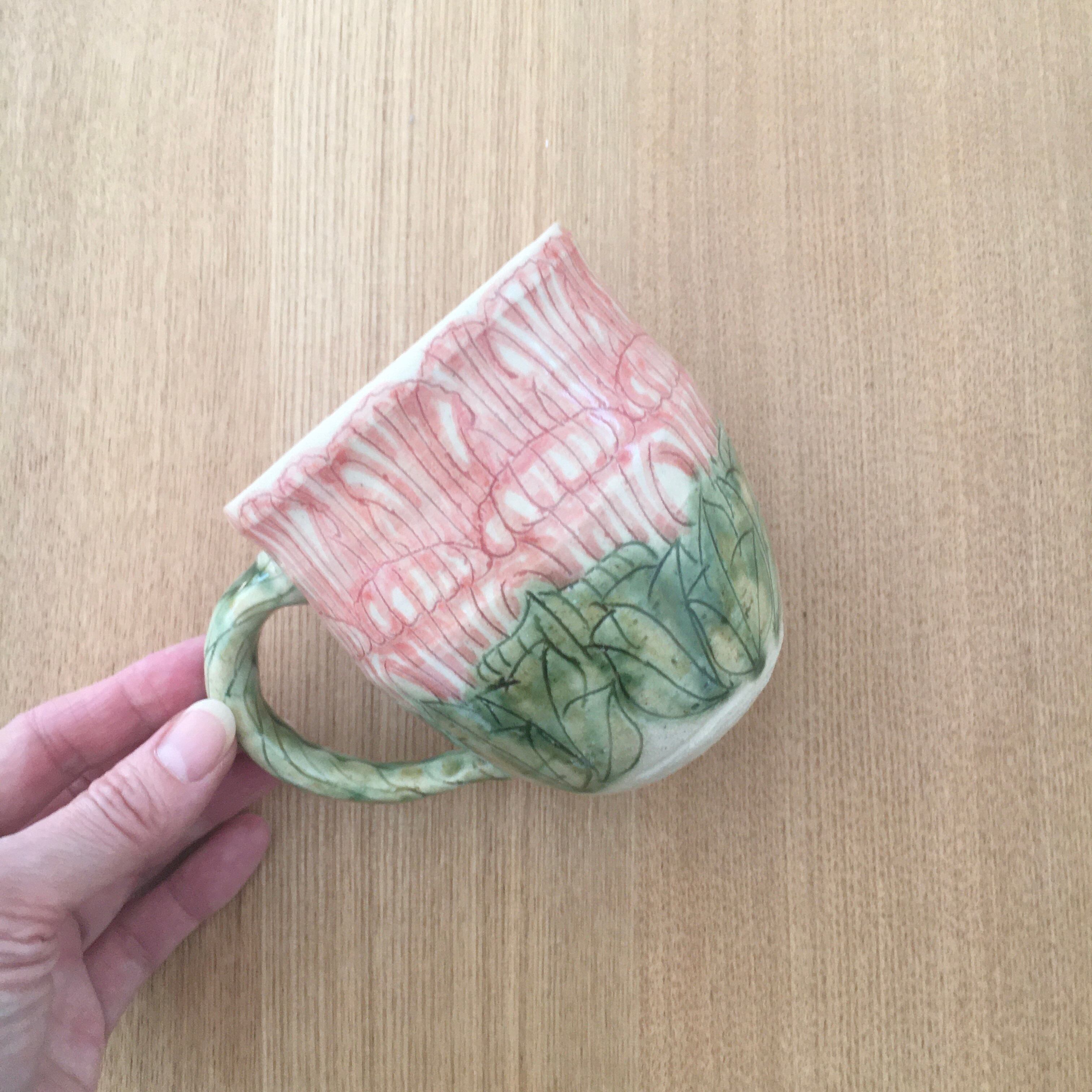 花びらのピンクと葉のグリーンが優しい色味のマグカップ。手に取ると見た目以上に軽く、ほっと一息の時間に是非使っていただきたい商品です。