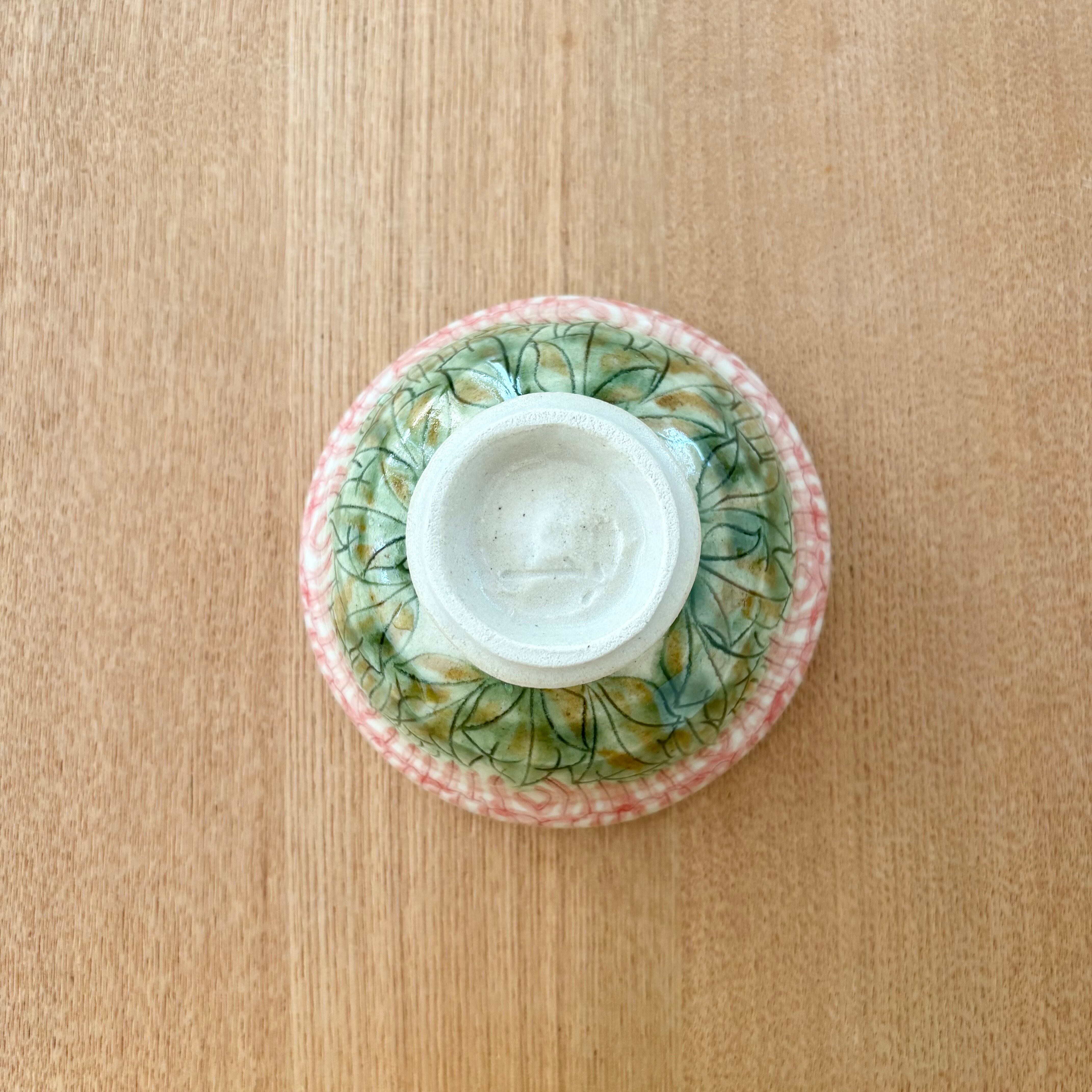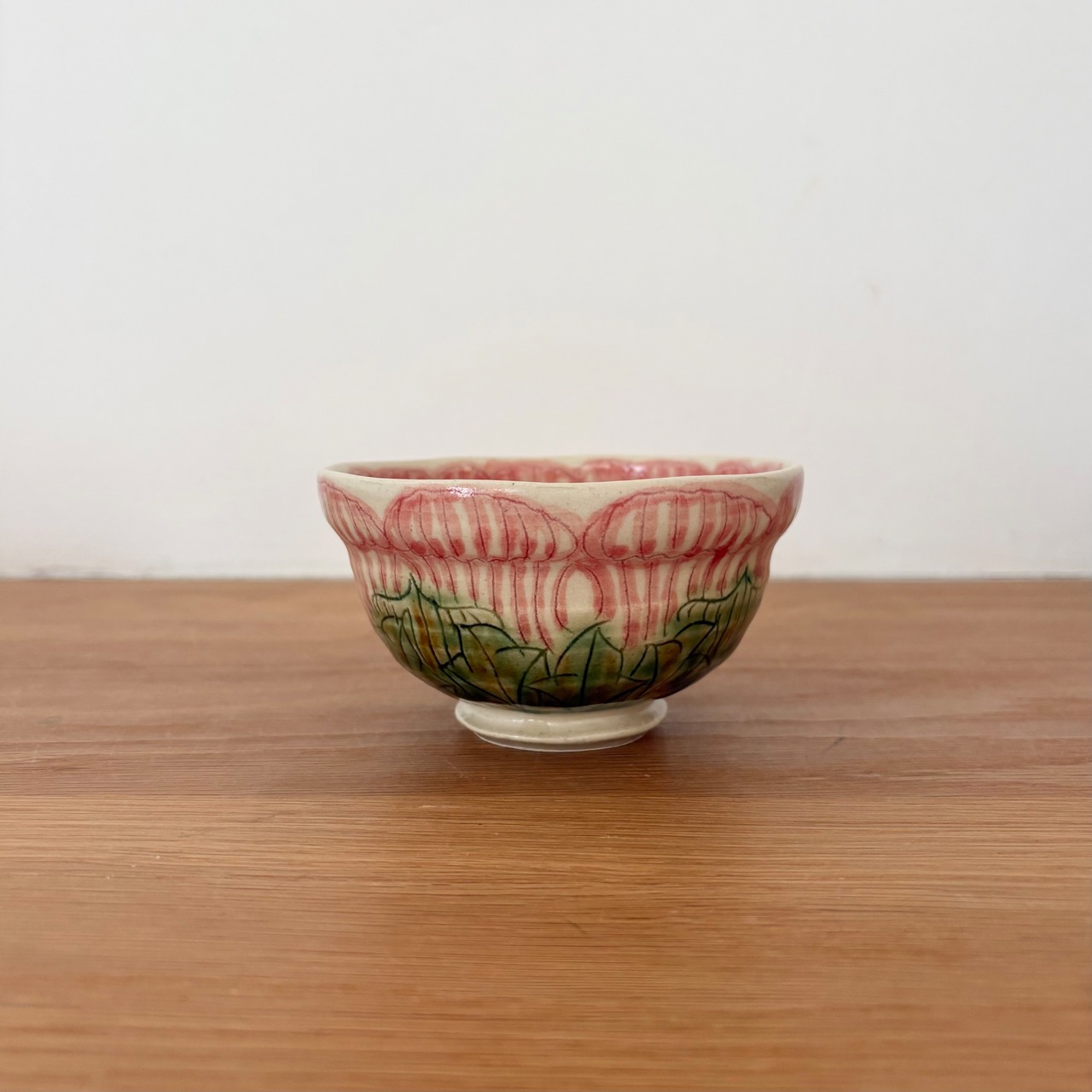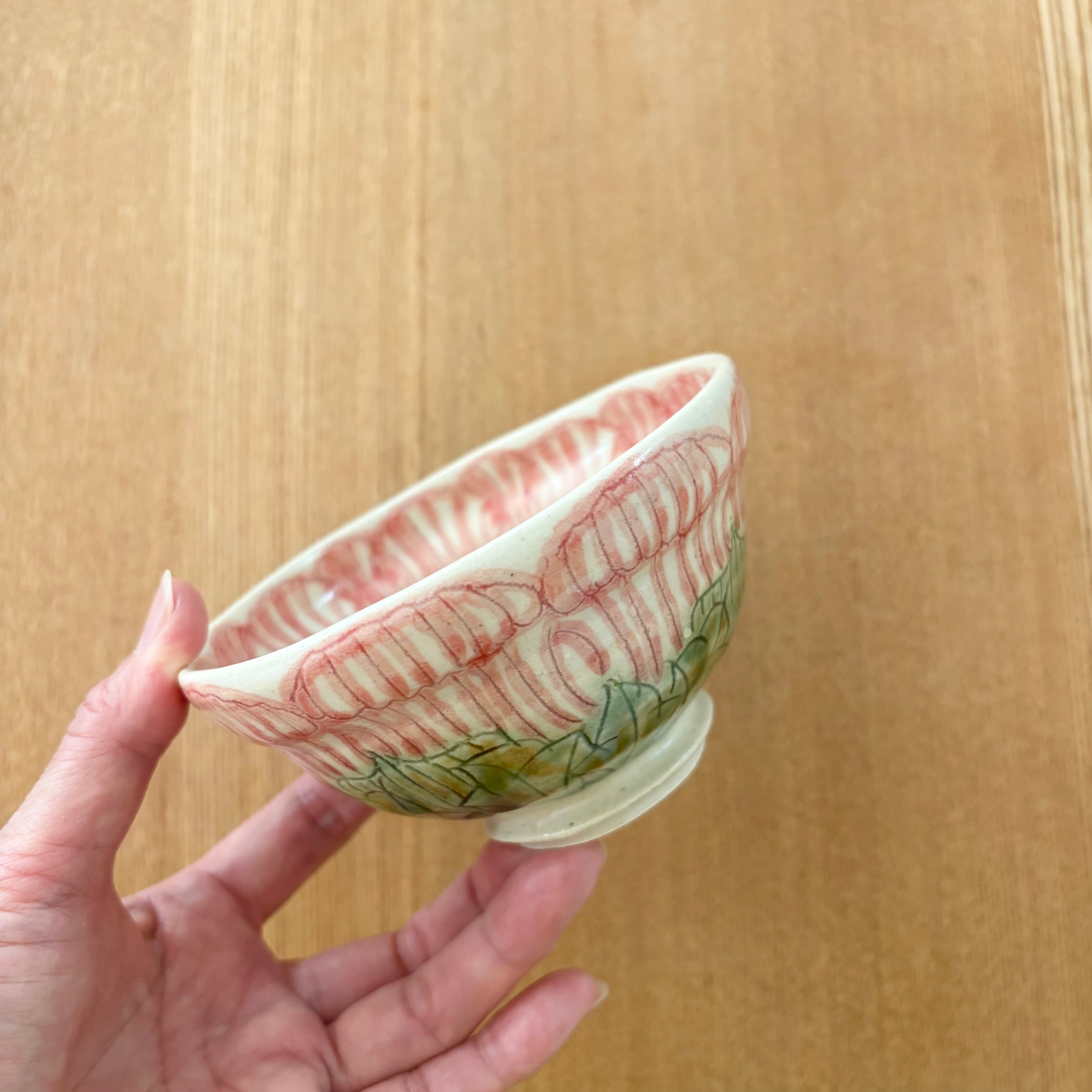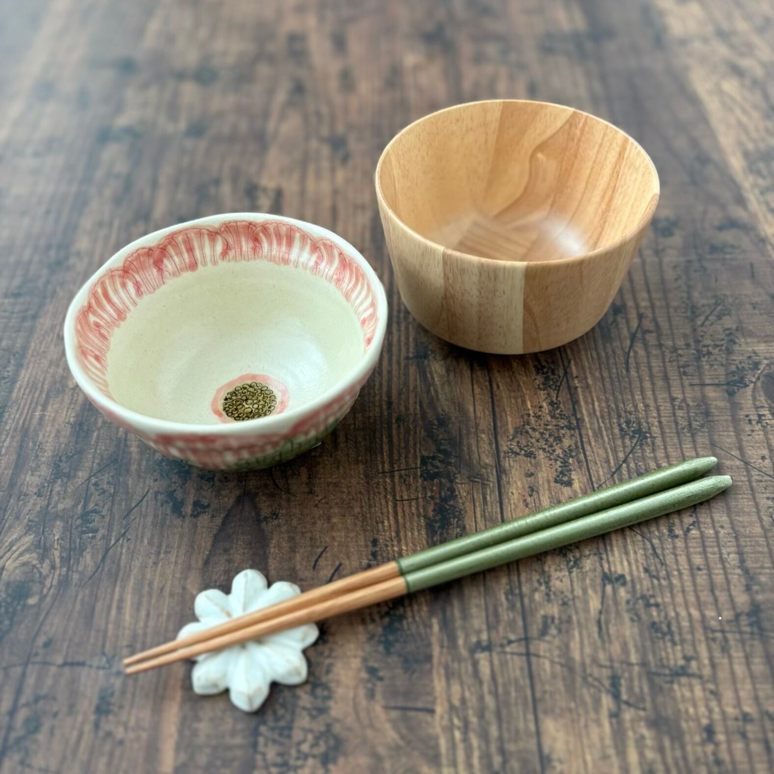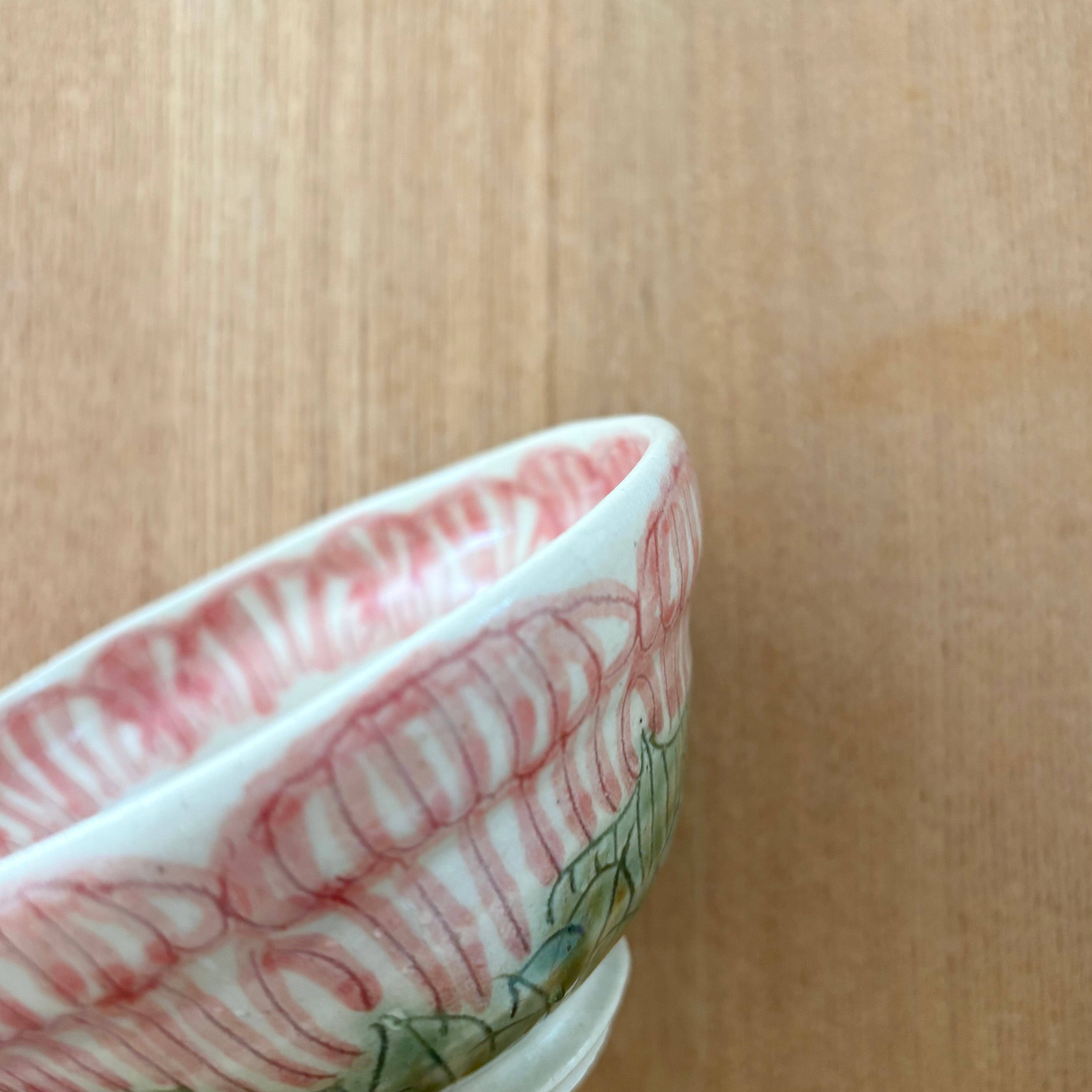 花びらのピンクと葉のグリーンが優しい色味のお茶碗。内側にも絵が描かれてるので食べた後もつい笑みがこぼれます。手に取ると見た目以上に軽く、ご飯の時間が益々楽しい時間になることでしょう。