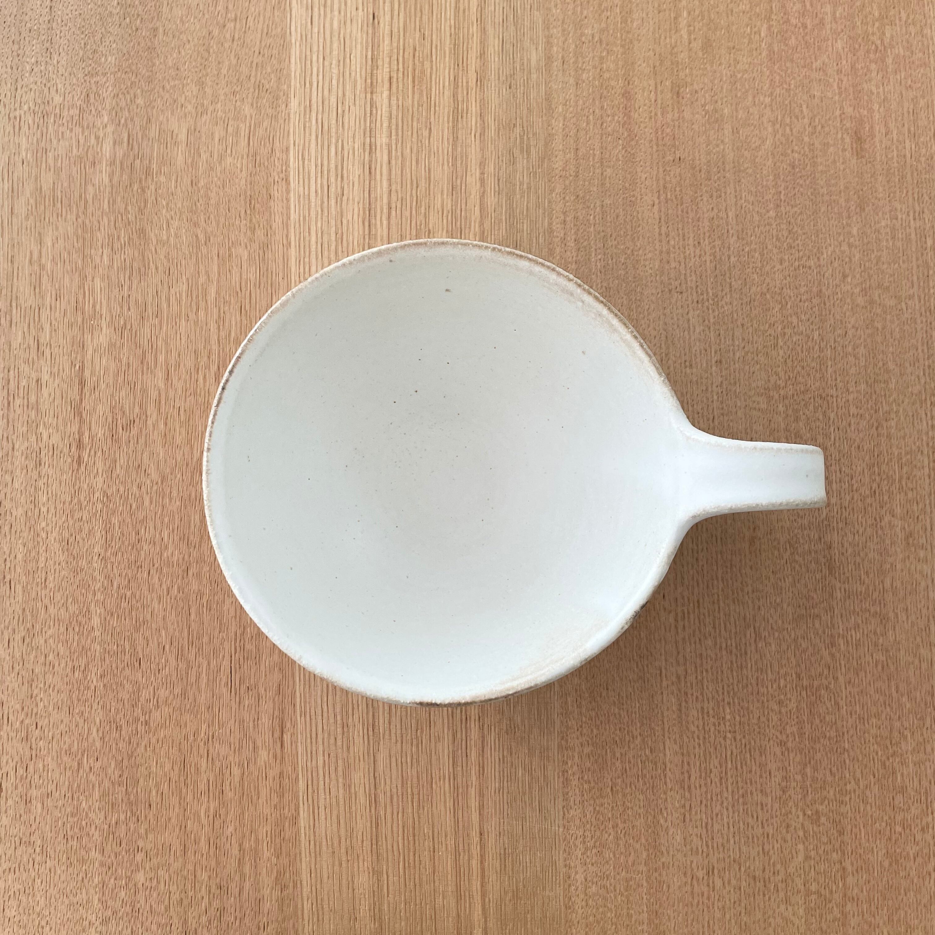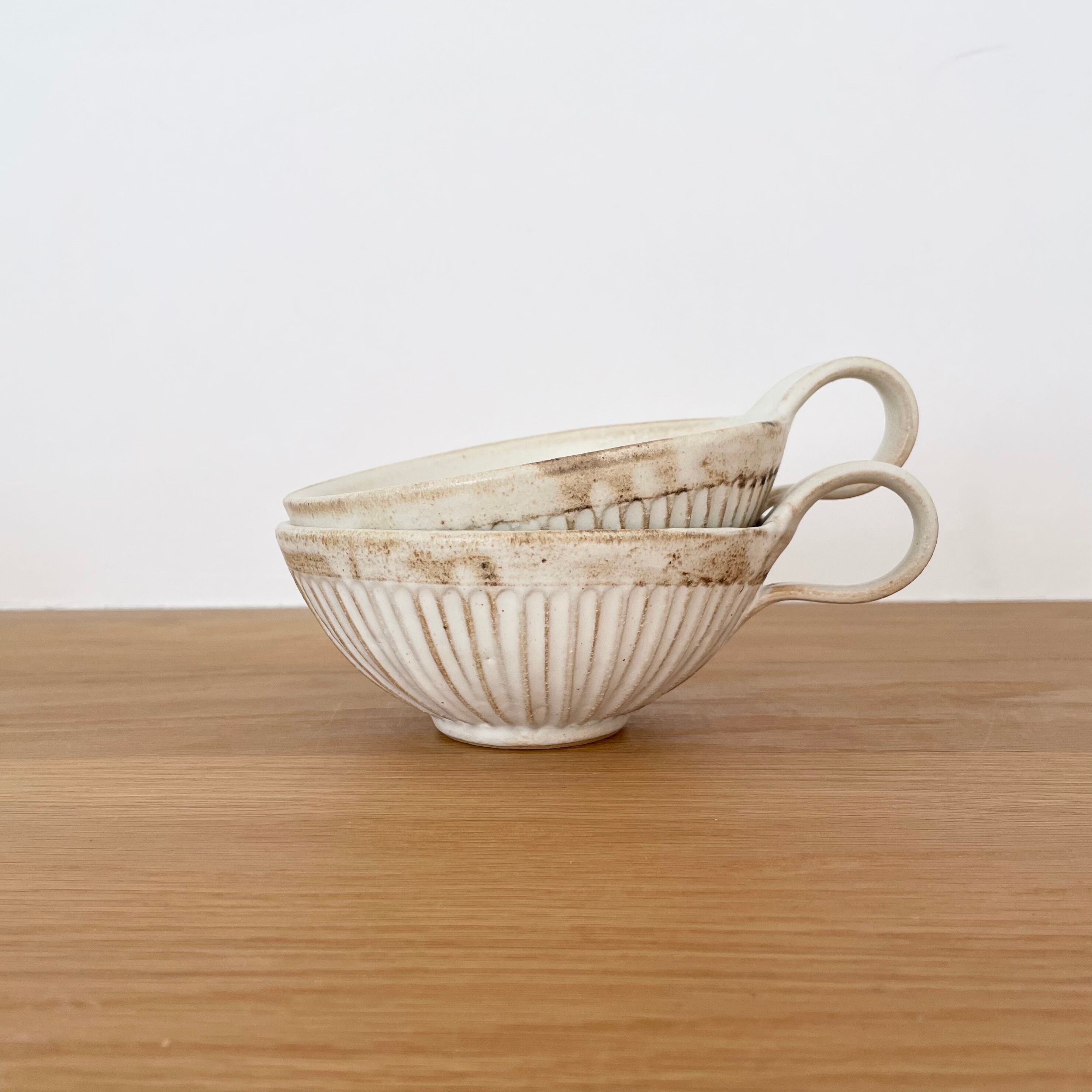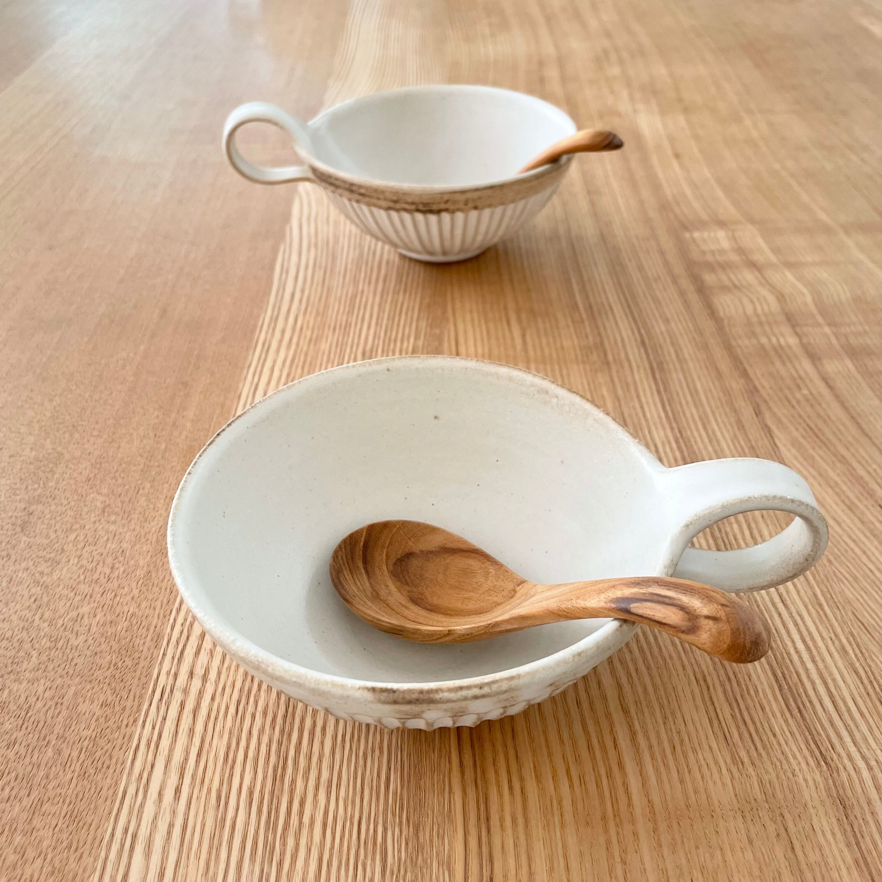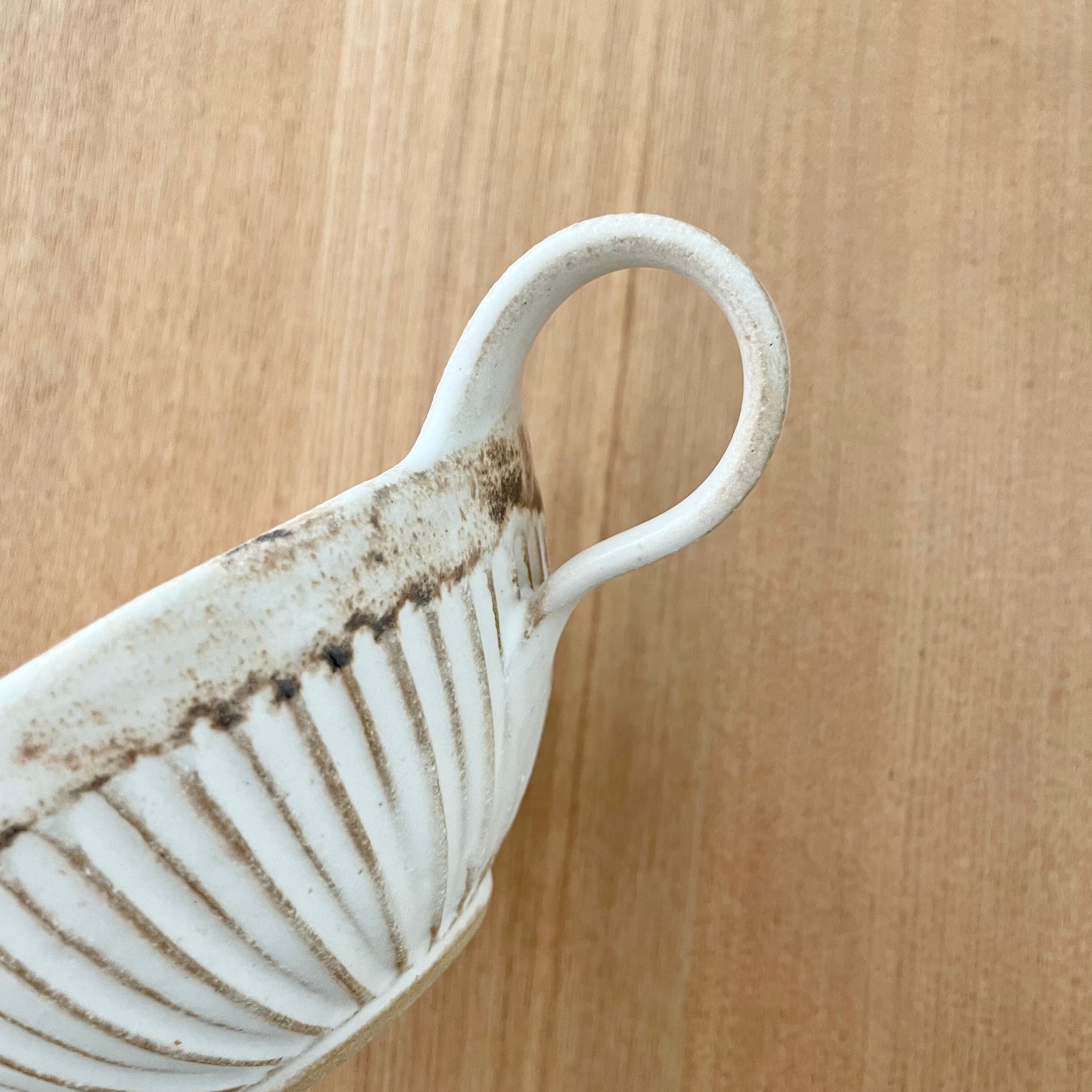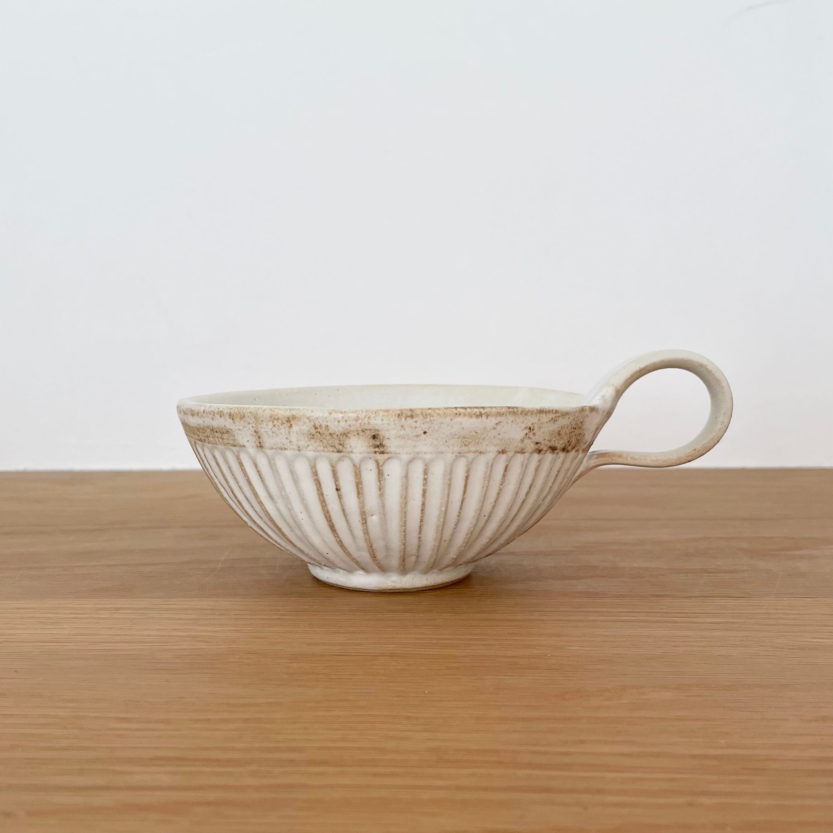 スリムラインを施すことによってフォルムの輪郭を強調したシンプルなデザイン。そしてそのスッとしたデザインに柔らかい曲線の取手、マットな質感が大人かわいいうつわに仕上がっています。