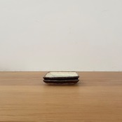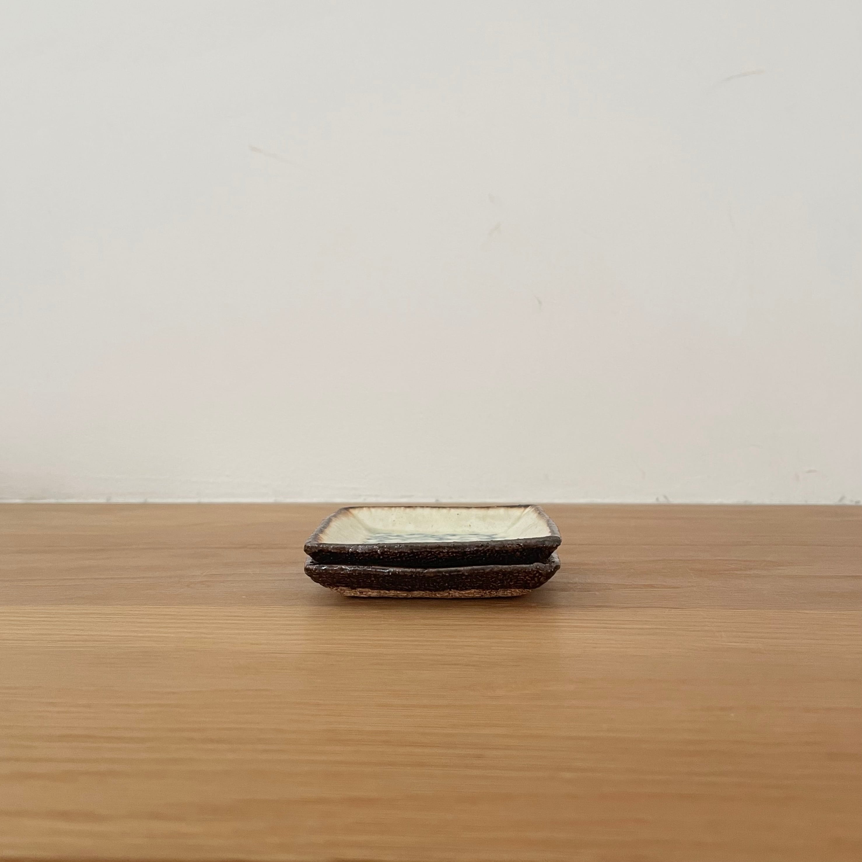 布目のような淡い水色の模様が優しい雰囲気の角小皿。この模様は蓮見さんオリジナルの消しゴムハンコで付けられているそうです。錆色の縁どりでアンティークっぽく味わい深い仕上がりになっています。お漬物や薬味入れでも、お茶の時間にチョコレートやクッキーを、ワインのあてにチーズやオリーブなどいかがですか?