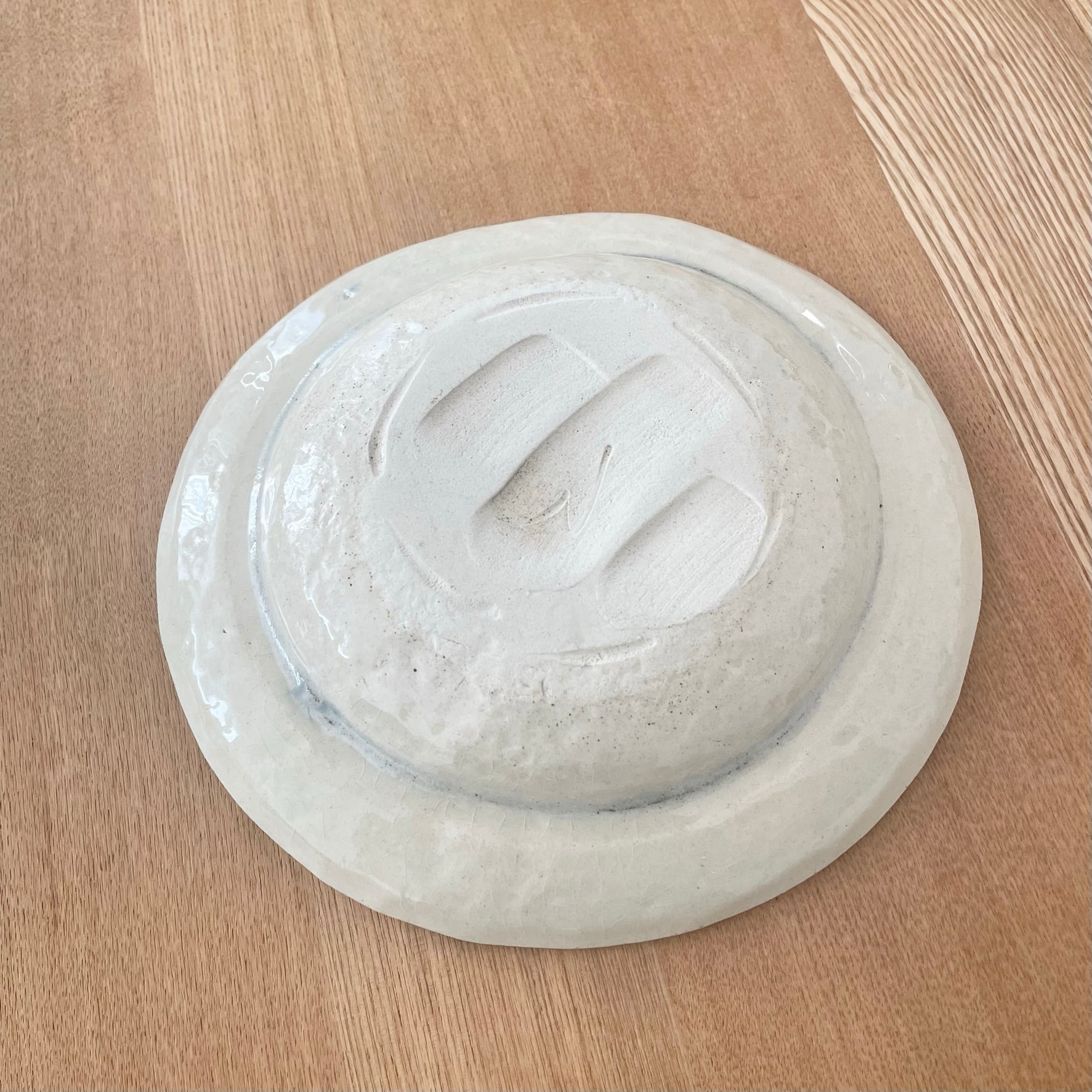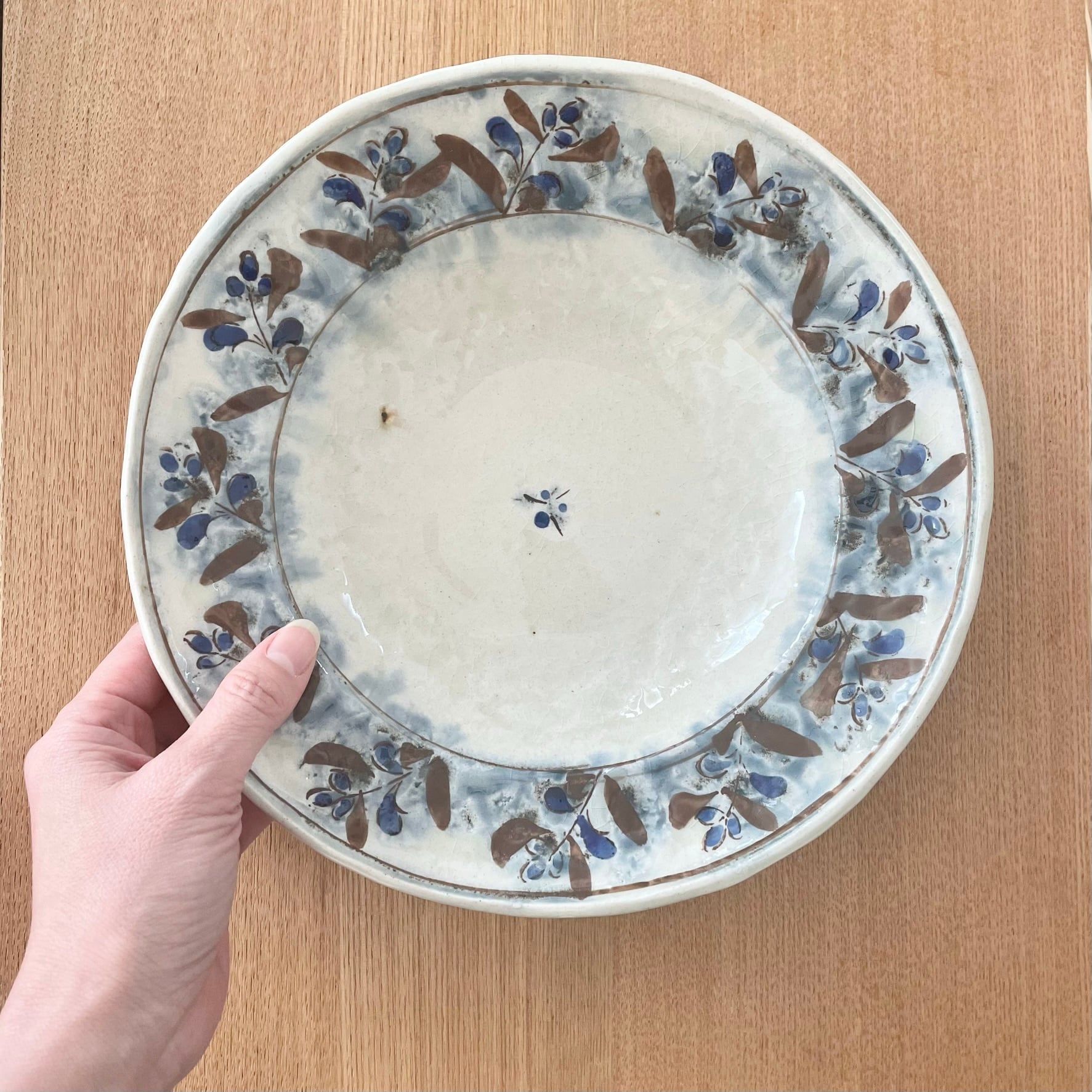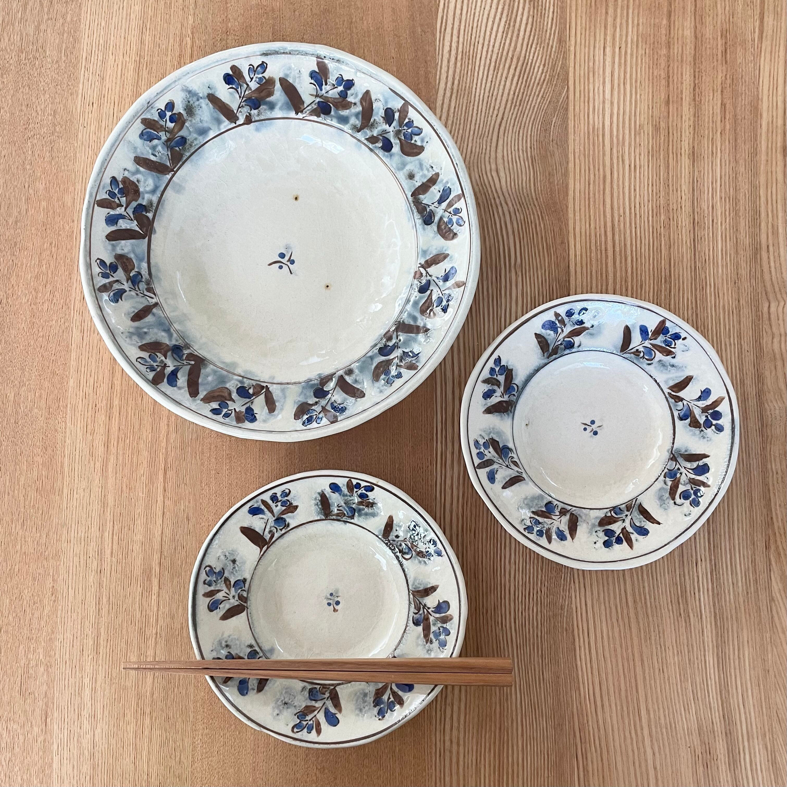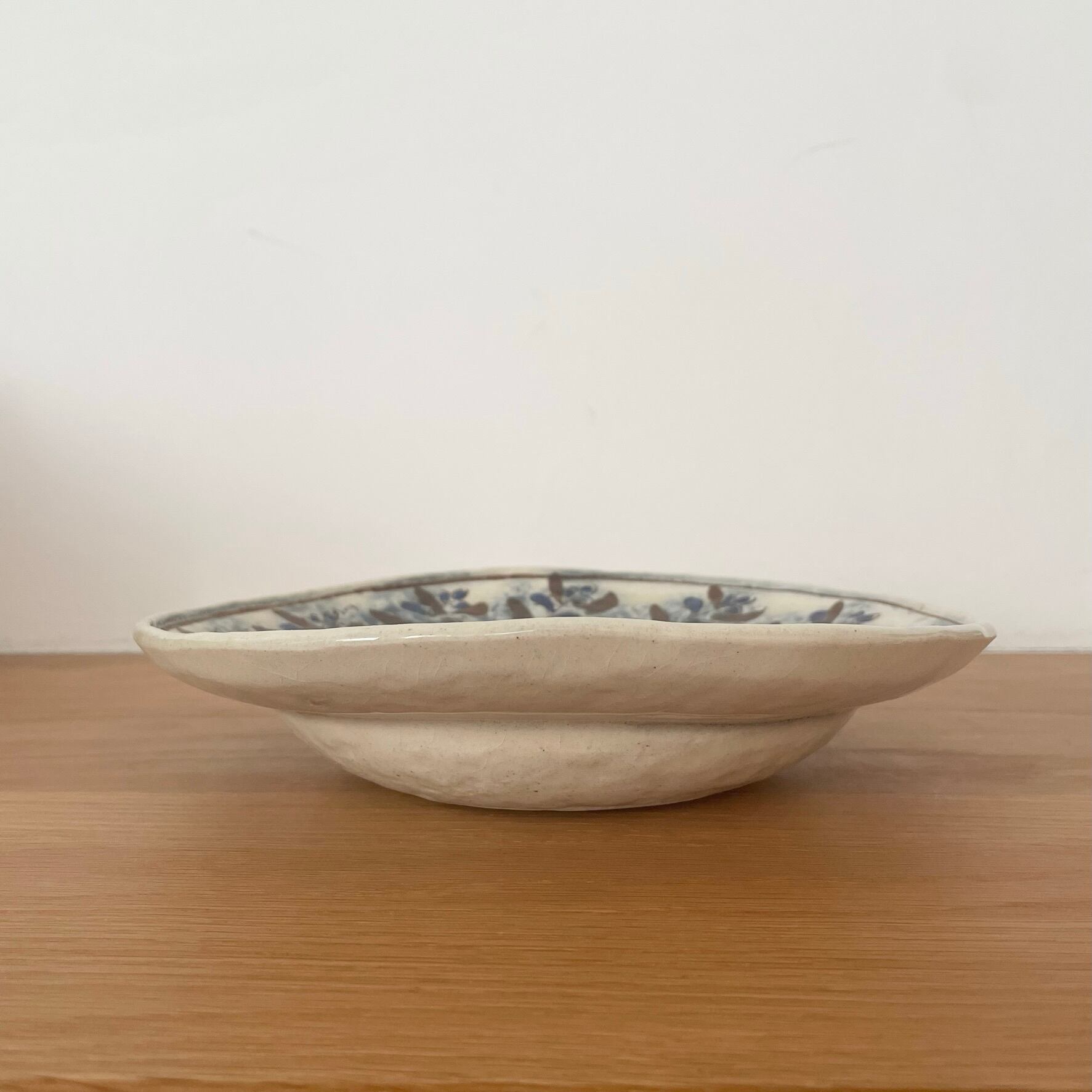 生成りの生地に茶とブルーが相性良く馴染み、お料理を華やかに引き立ててくれるリム鉢。また、少しいびつな曲線と表面の凹凸がより柔らかい雰囲気を醸し出してくれています。