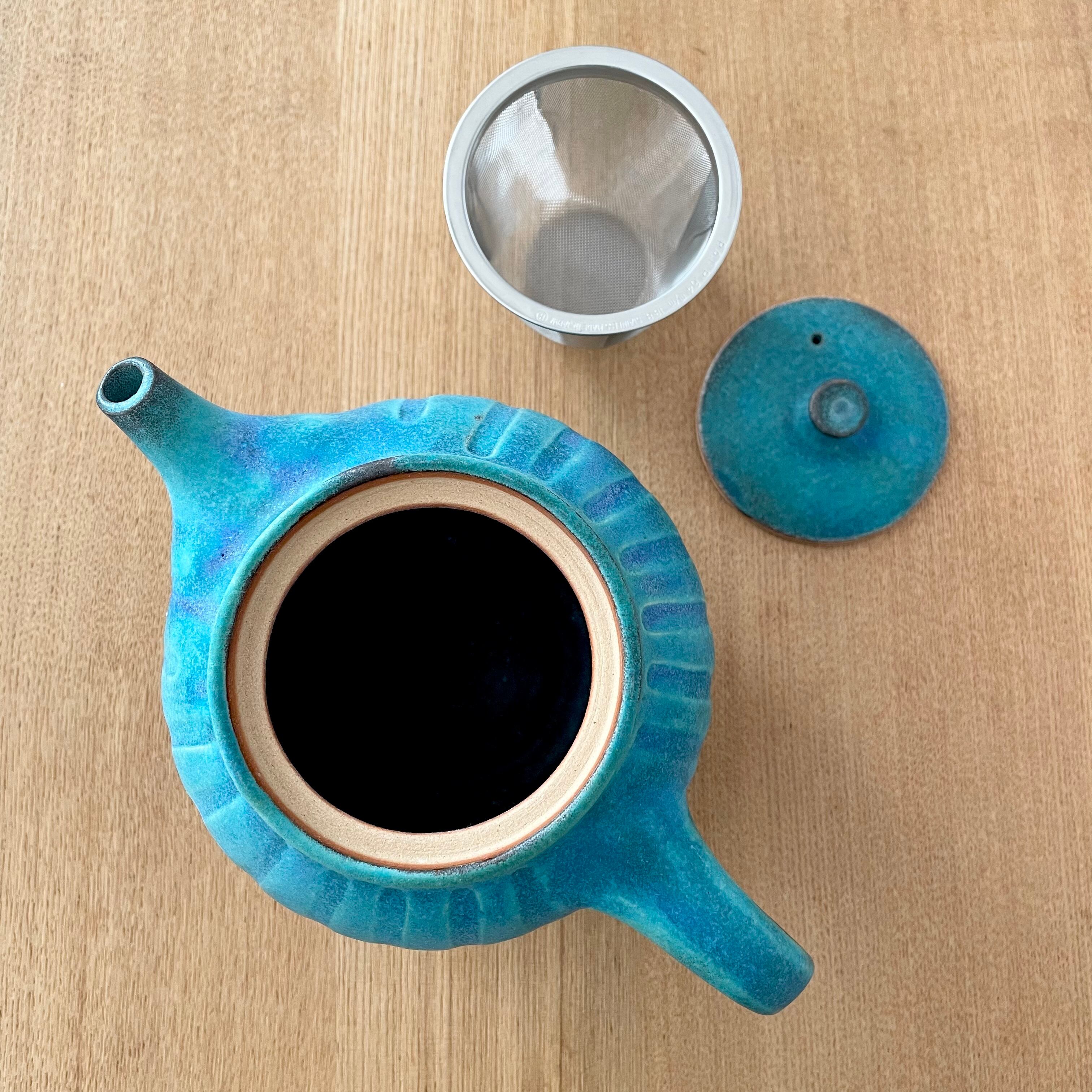 まんまるのかわいらしいフォルムと、美しいターコイズブルーが魅力のティーポット。美しくバランスのとれたデザインは紅茶でもお茶でもシーンを選ばずお使い頂けます。また陶器のポットには珍しく、最初から茶こしが付いているのが嬉しいポイント。