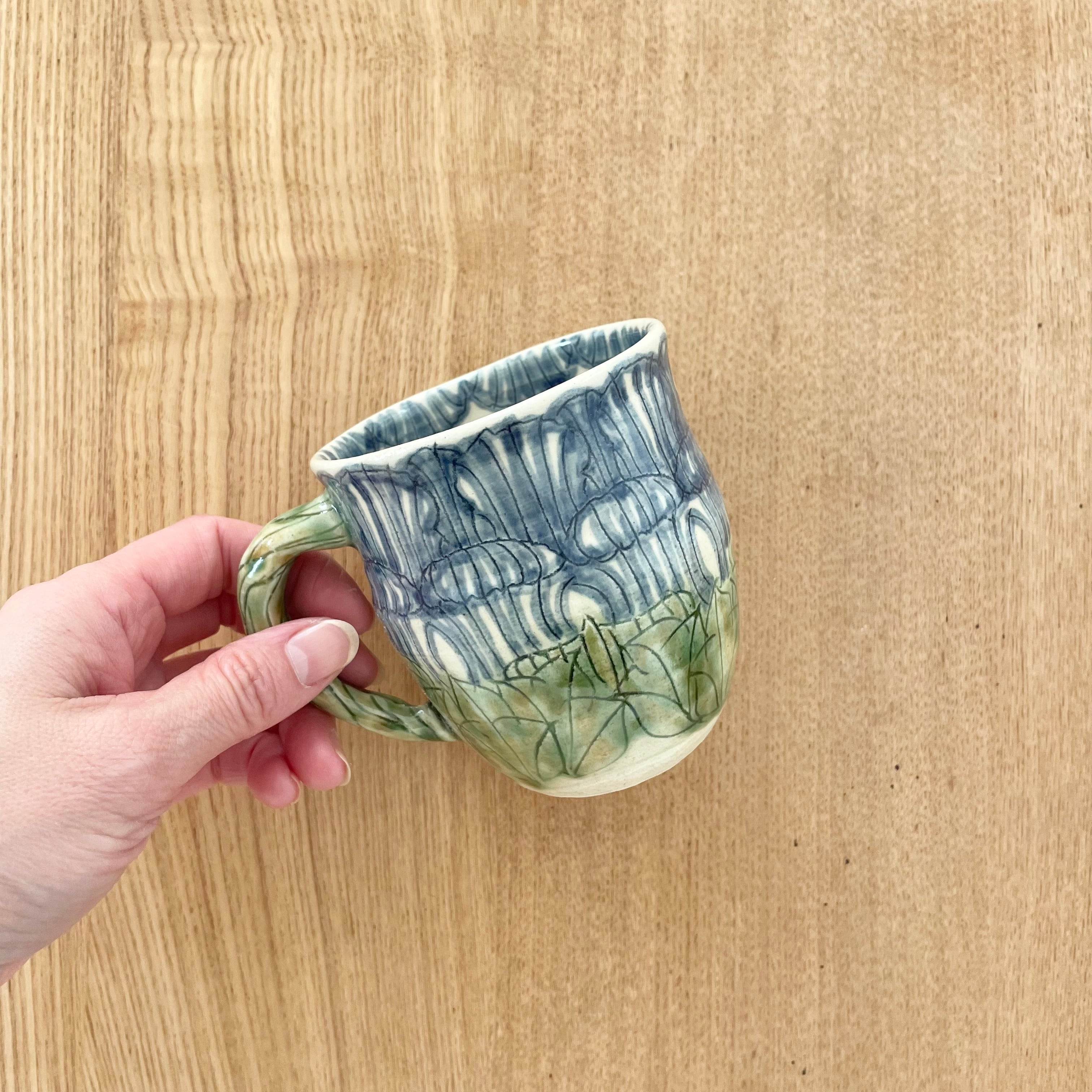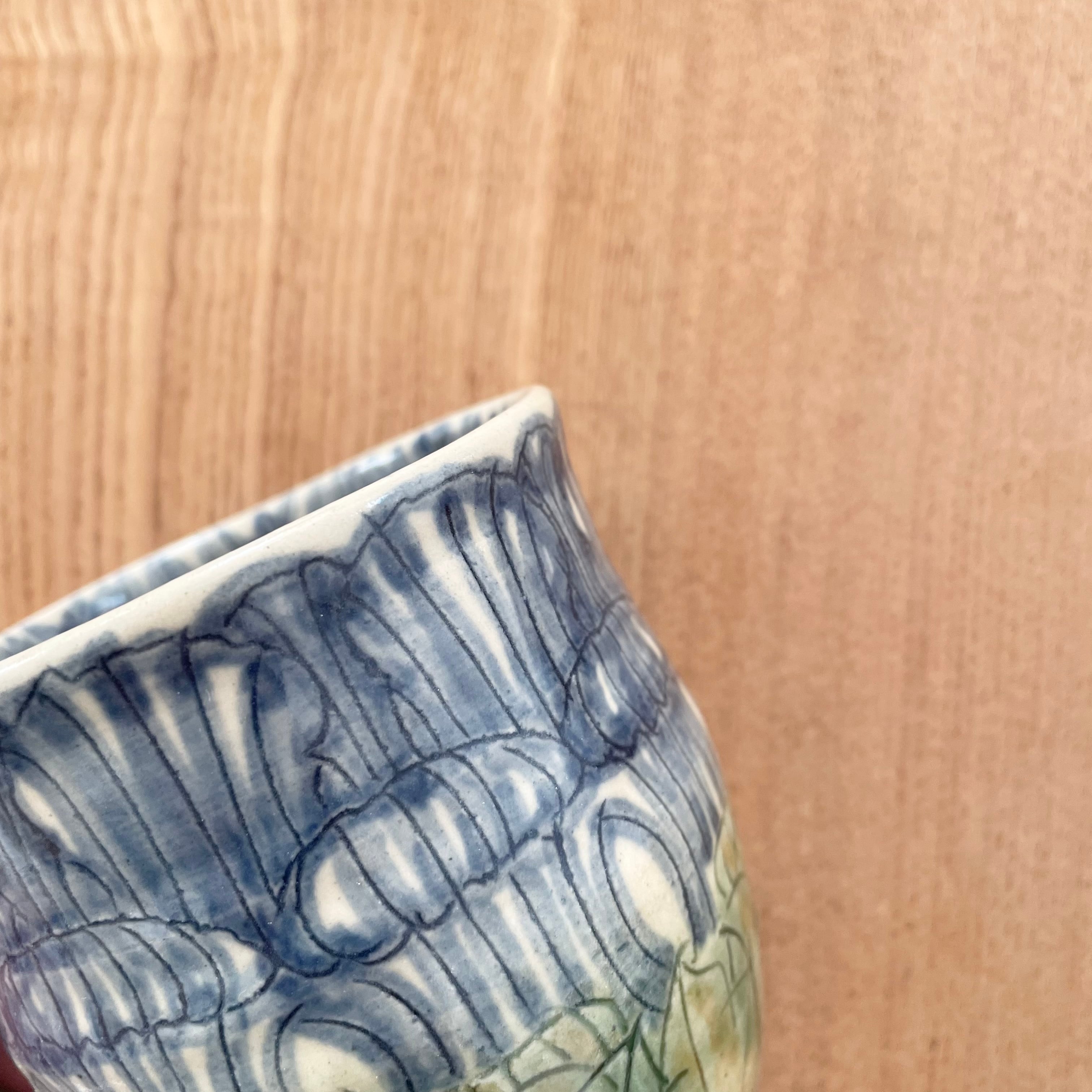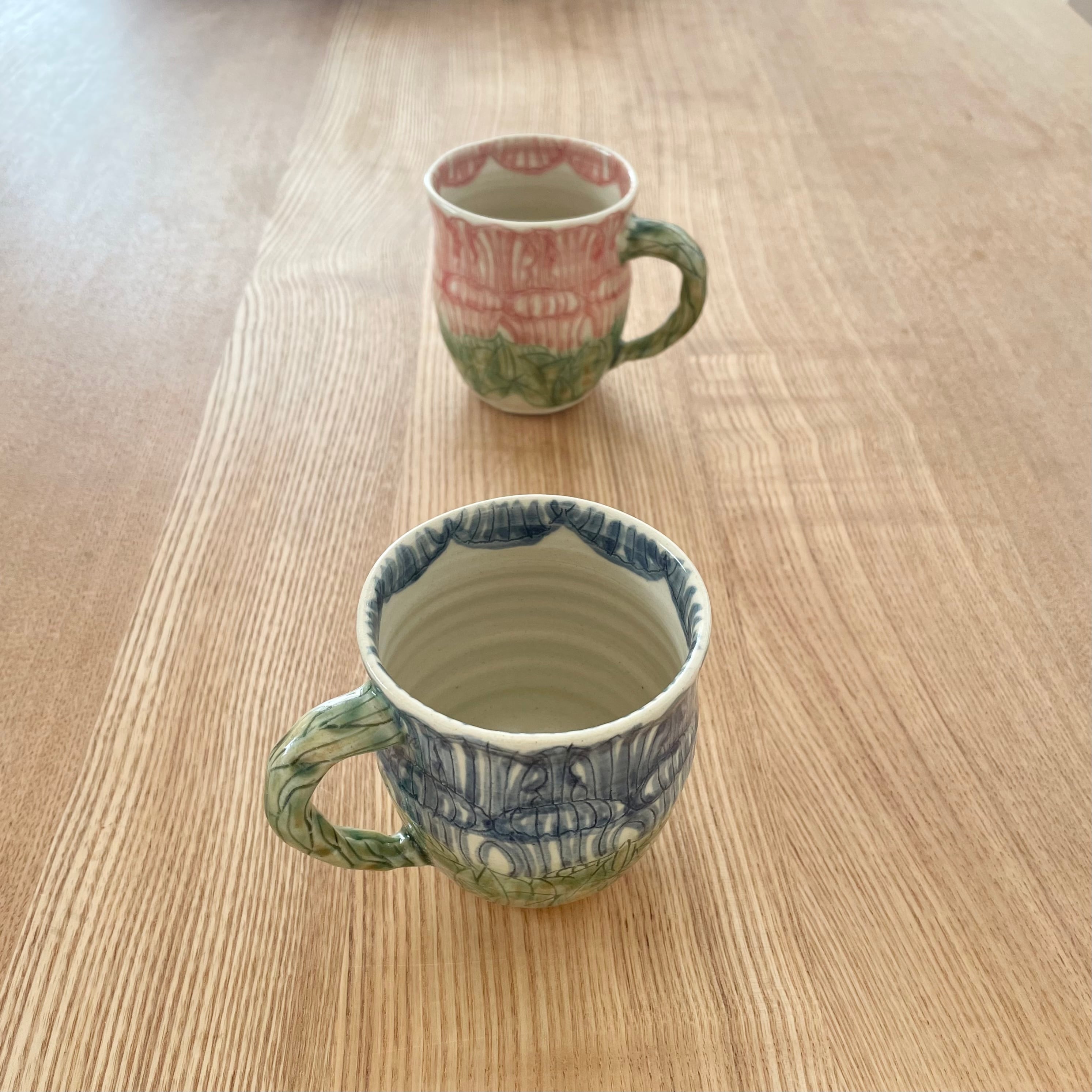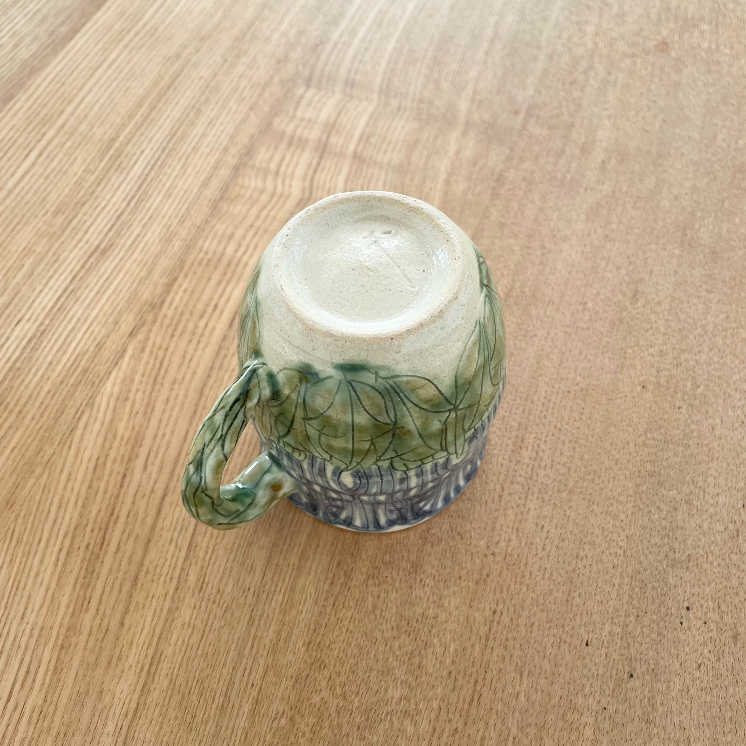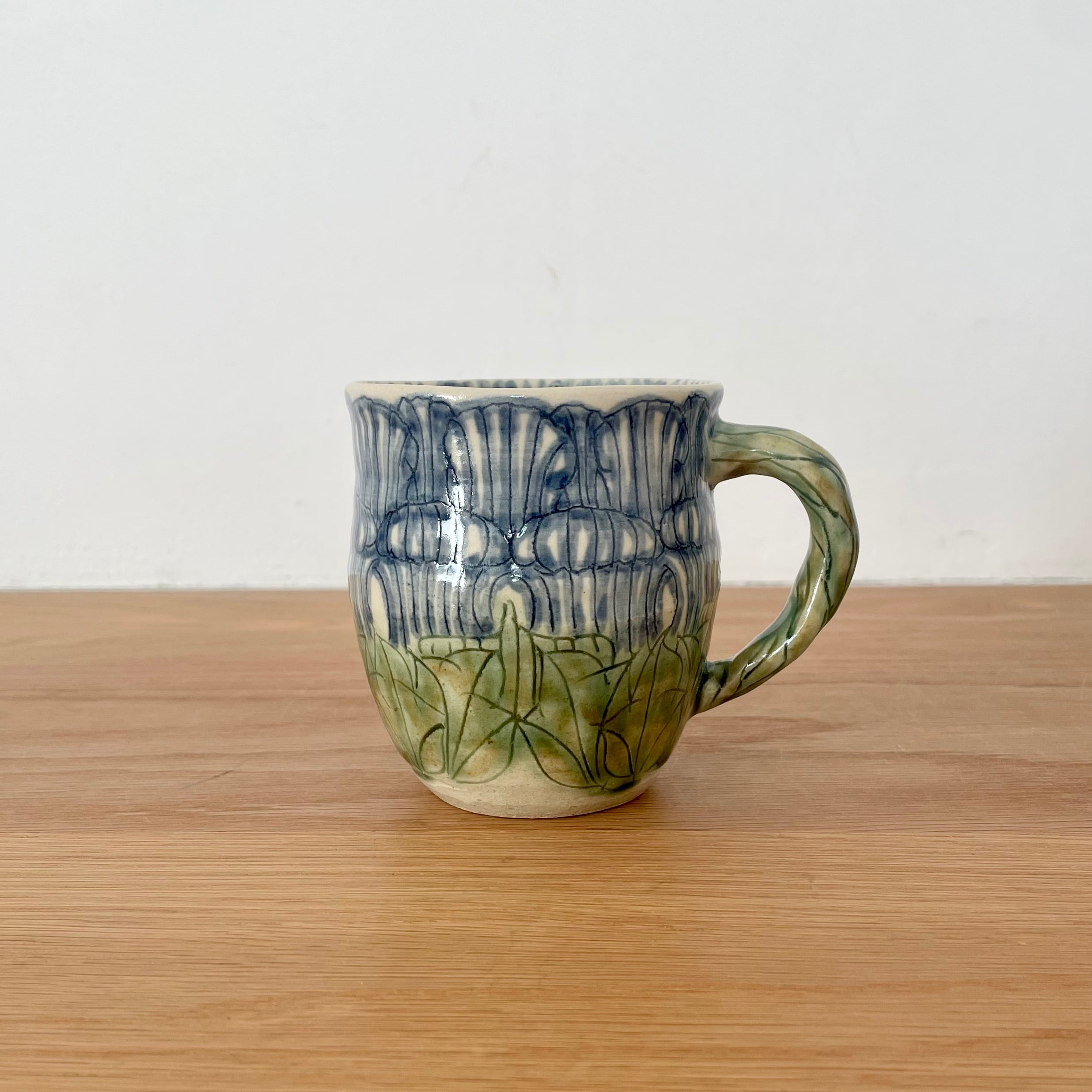 花びらのブルーと葉のグリーンが優しい色味のマグカップ。手に取ると見た目以上に軽く、ほっと一息の時間に是非使っていただきたい商品です。
